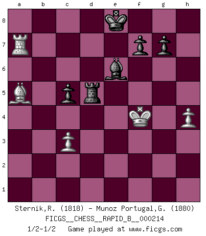 Last move : 1/2-1/2 2014 February 28 23:48:0 [Event "FICGS__CHESS__RAPID_B__000214"] [Site "FICGS"] [Date "2014.01.05"] [Round "1"] [White "Sternik,Ryszard"] [Black "Munoz Portugal,Guillermo"] [Result "1/2-1/2"] [WhiteElo "1818"] [BlackElo "1880"] 1.e4 e5 2.Nf3 Nc6 3.d4 exd4 4.Bc4 Bb4 5.c3 dxc3 6.Nxc3 Nge7 7.O-O Bxc3 8.bxc3 O-O 9.Bg5 h6 10.Bh4 d6 11.Rb1 Bg4 12.Rxb7 Na5 13.Rb4 Nxc4 14.Rxc4 Qd7 15.h3 Be6 16.Qa4 Qxa4 17.Rxa4 Nc8 18.Nd4 Nb6 19.Ra5 Bd7 20.Rb1 Nc4 21.Ra6 Nd2 22.Re1 Rfb8 23.Nc6 Rb6 24.Rxb6 axb6 25.Ne7+ Kf8 26.Nd5 Ra7 27.Bd8 c6 28.Nxb6 Ke8 29.Bh4 Ra6 30.Rd1 Nxe4 31.Re1 Rxb6 32.Rxe4+ Be6 33.f4 Rb1 34.Kh2 Kd7 35.f5 Bxa2 36.Re7+ Kc8 37.Bg3 Rb2 38.Bxd6 Bd5 39.h4 Rxg2 40.Kh3 Rf2 41.Kg4 h5 42.Kxh5 Rxf5 43.Kg4 Be6 44.Kg3 Rd5 45.Bb4 Kd8 46.Ra7 c5 47.Ba5+ Ke8 48.Kf4 Rh5 49.Kg3 Rd5 50.Kf4 1/2-1/2 Scotch gambit Kingside Castling by player White (move 7) Kingside Castling by player Black (move 8) This chess game ended in a draw. Follow this game move after move (download)Man is a frivolous, a specious creature, and like a Chess player, cares more for the process of attaining his goal than for the goal itself. (Dostoyevsky) Es ist wirklich schade, dass so viele Schachspieler nicht auf ihr Äußeres achten! (Alexandra Kosteniuk) Cuando tengas duda... ¡juega al Ajedrez!. (Tevis) En blitz, le Cavalier l'emporte sur le Fou. (Vlastimil Hort) Statistics can be made to prove anything - even the truth. (Author unknown)