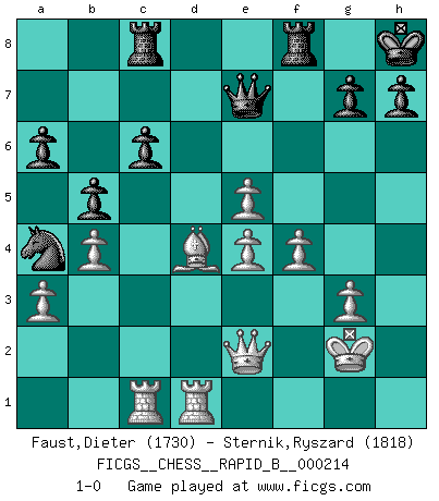 Last move : 1-0 2014 February 13 23:10:2 [Event "FICGS__CHESS__RAPID_B__000214"] [Site "FICGS"] [Date "2014.01.05"] [Round "1"] [White "Faust,Dieter"] [Black "Sternik,Ryszard"] [Result "1-0"] [WhiteElo "1730"] [BlackElo "1818"] 1.d4 e6 2.c4 d5 3.Nf3 c6 4.Qc2 Nf6 5.g3 Na6 6.a3 dxc4 7.Qxc4 Be7 8.Nc3 O-O 9.Bg2 Nc7 10.O-O Ncd5 11.Qd3 b6 12.Ne5 Bb7 13.b4 Nd7 14.Ng4 f5 15.Ne3 a6 16.Bd2 Rc8 17.Nc4 N7f6 18.Rfc1 f4 19.Bh3 fxg3 20.Bxe6+ Kh8 21.hxg3 Rc7 22.e4 Nxc3 23.Bxc3 Bc8 24.Bxc8 Rxc8 25.f4 b5 26.Ne5 Bd6 27.Qe2 Qe7 28.Kg2 Bxe5 29.dxe5 Nd7 30.Rd1 Nb6 31.Bd4 Na4 32.Rac1 1-0 Queen's pawn Kingside Castling by player Black (move 8) Kingside Castling by player White (move 10) Player White won this chess game. Follow this game move after move (download)First-class players lose to second-class players because second-class players sometimes play a first-class game. (Siegbert Tarrasch) Die Fehler sind da, Sie warten nur darauf gemacht zu werden. (Savielly Grigorievitsch Tartakower) No puedes jugar al Ajedrez si eres de corazón noble. (Proverbio Francés) Soyez une menace à chaque fois que vous vous asseyez pour jouer. (Ken Smith) Life is like a ten-speed bicycle: most of us have gears we never use. (Charles M. Schulz)