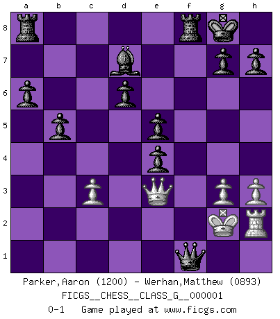 Last move : 0-1 2006 August 18 5:25:7 [Event "FICGS__CHESS__CLASS_G__000001"] [Site "FICGS"] [Date "2006.05.25"] [Round "1"] [White "Parker,Aaron"] [Black "Werhan,Matthew"] [Result "0-1"] [WhiteElo "1200"] [BlackElo "0893"] 1.e4 e5 2.Bc4 d6 3.Qf3 Nf6 4.h3 Nc6 5.Bb5 Bd7 6.c3 Be7 7.Qd3 a6 8.Bc4 Na5 9.b3 b5 10.Bd5 c6 11.b4 cxd5 12.bxa5 dxe4 13.Qg3 Nh5 14.Qh2 Nf4 15.Na3 Nd3+ 16.Kf1 Qxa5 17.Nc2 Qa4 18.Ne3 f5 19.Ba3 Qxa3 20.Nd5 Qc5 21.Ne3 f4 22.Ne2 fxe3 23.dxe3 Qa3 24.Qg3 O-O 25.Kg1 Nxf2 26.Rh2 Qb2 27.Re1 Nd3 28.Rd1 Qxe2 29.Rb1 Qxa2 30.Re1 Nxe1 31.Qxe1 Bg5 32.g3 Bxe3+ 33.Qxe3 Qb1+ 34.Kg2 Qf1+ 0-1 Bishop's Opening Kingside Castling by player Black (move 24) Player Black won this chess game. Follow this game move after move (download)We cannot resist the fascination of sacrifice, since a passion for sacrifices is part of a Chessplayer's nature. (Rudolf Spielman) Je mehr ich von der FIDE weiss, um so weniger verstehe ich. (Alexander Kalifman) El Ajedrez es un juego de pelea el cual es puramente intelectual e incluye la suerte. (Richard Reti) À la honte des hommes, on sait que les lois du jeu sont les seules qui soient partout justes, claires, inviolables et exécutées. Pourquoi l'Indien qui a donné les règles du jeu d'échecs est-il obéi de bon gré dans toute la terre, et que les décrétales des papes, par exemple, sont aujourd'hui un objet d'horreur et de mépris ? C'est que l'inventeur des échecs combina tout avec justesse pour la satisfaction des joueurs, et que les papes, dans leurs décrétales, n'eurent en vue que leur seul avantage. L'Indien voulut exercer également l'esprit des hommes et leur donner du plaisir; les papes ont voulu abrutir l'esprit des hommes. Voltaire (Dictionnaire philosophique / Garnier 1967) A woman without a man is like a fish without a bicycle. (Gloria Steinem)