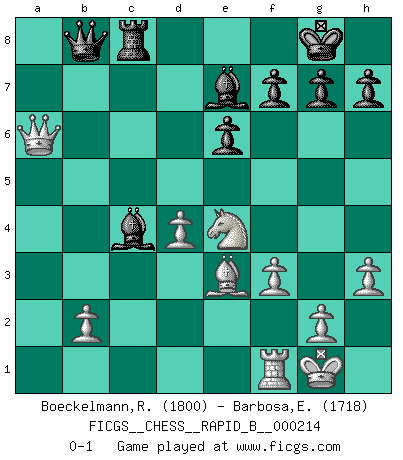 Last move : 0-1 2014 February 22 21:55:51 [Event "FICGS__CHESS__RAPID_B__000214"] [Site "FICGS"] [Date "2014.01.05"] [Round "1"] [White "Boeckelmann,Raik"] [Black "Barbosa,Edinardo"] [Result "0-1"] [WhiteElo "1800"] [BlackElo "1718"] 1.e4 c5 2.Nf3 e6 3.d4 cxd4 4.Qxd4 Nc6 5.Qd1 Nf6 6.Nc3 d6 7.Bd3 Be7 8.O-O O-O 9.Nd2 a6 10.Nf3 Qc7 11.Be3 b5 12.a3 Bb7 13.h3 b4 14.axb4 Nxb4 15.Qe2 Nxd3 16.cxd3 Rfc8 17.Nd2 d5 18.exd5 Nxd5 19.Nxd5 Bxd5 20.f3 Qg3 21.Ne4 Qe5 22.d4 Qb8 23.Rxa6 Rxa6 24.Qxa6 Bc4 0-1 Sicilian defense Kingside Castling by player White (move 8) Kingside Castling by player Black (move 8) Player Black won this chess game. Follow this game move after move (download)Chess is like war on a board. (Bobby Fischer) Der Verteidiger gebe der Gewalt nach, aber nur der Gewalt. Er schaffe sich nicht freiwillig, etwa aus Blindheit oder aus Schrecken, irgendwelche Schwächen. Er lasse sich nicht bluffen. (Emanuel Lasker) El Ajedrez es el gimnasio de la mente. (Blaise Pascal) C'est une question de caractère, Beaucoup de gens perdent leur motivation très vite. D'autres, ils sont rares, peuvent la conserver très longtemps. J'aime les échecs, encore aujourd'hui je suis heureux d'analyser des parties. J'aime toujours gagner, je déteste encore perdre. Bien jouer est important pour mon intégrité intellectuelle et morale. Et puis les échecs vivent en ce moment une période historique grâce à Internet. Ils se développent dans les systèmes éducatifs à travers le monde. Ils sortent de leur ghetto, et c'est mon rôle de mener à bien cette révolution. (Gary Kasparov) There's no money in correspondence chess. (John Knudsen)