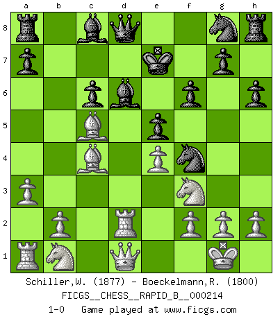 Last move : 1-0 2014 January 17 1:11:35 [Event "FICGS__CHESS__RAPID_B__000214"] [Site "FICGS"] [Date "2014.01.05"] [Round "1"] [White "Schiller,Wilfried"] [Black "Boeckelmann,Raik"] [Result "1-0"] [WhiteElo "1877"] [BlackElo "1800"] 1.d4 d5 2.c4 e6 3.Nf3 dxc4 4.e3 Nc6 5.Bxc4 Bd6 6.a3 Nce7 7.e4 c6 8.O-O h6 9.Re1 Ng6 10.d5 e5 11.dxc6 bxc6 12.Be3 f6 13.Re2 Nf4 14.Rd2 Ke7 15.Bc5 1-0 Queen's gambit declined Kingside Castling by player White (move 8) Player White won this chess game. Follow this game move after move (download)Those who say they understand Chess, understand nothing. (Robert Hubner) Ich habe Kasparov in Rente geschickt. (Veselin Topalov) Todo se encuentra en un estado de flujo y esto incluye al mundo del Ajedrez. (Mikhail Botvinnik) Roi des jeux et jeu des rois, les échecs portent en eux un sentiment d'infini. Ils donnent à celui qui s'est efforcé d'en approfondir les arcanes l'impression de n'être pas à la mesure de l'homme; en fait, ils constituent un résumé de l'univers, un microcosme, et figurent cette grande échelle qui, dans les plans de la lumière descend jusqu'à la matière, qui des abîmes insondables remonte jusqu'en l'infini de Dieu. (Pyrame) If you work for a living, why do you kill yourself working ? (Tuco to a chicken in The Good, The Bad and The Ugly)