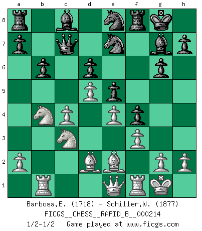 Last move : 1/2-1/2 2014 January 23 23:15:11 [Event "FICGS__CHESS__RAPID_B__000214"] [Site "FICGS"] [Date "2014.01.05"] [Round "1"] [White "Barbosa,Edinardo"] [Black "Schiller,Wilfried"] [Result "1/2-1/2"] [WhiteElo "1718"] [BlackElo "1877"] 1.d4 Nf6 2.c4 g6 3.Nc3 d6 4.e4 Bg7 5.Nf3 O-O 6.Be2 e5 7.O-O Nc6 8.d5 Ne7 9.Ne1 Ne8 10.f3 f5 11.Nd3 b6 12.Qe1 f4 13.Bd2 c5 14.b4 cxb4 15.Nxb4 Qc7 16.Rb1 1/2-1/2 King's Indian defense, 3.Nc3 Kingside Castling by player Black (move 5) Kingside Castling by player White (move 7) This chess game ended in a draw. Follow this game move after move (download)He who fears an isolated Queen's Pawn should give up Chess. (Siegbert Tarrasch) Wie, soll nun auch die Opposition abgeschafft werden? Ja, es tut mir leid, Ihnen diesen Schmerz nicht ersparen zu können. (Aaron Nimzowitsch) Debes de llevar a tu oponente hacia un profundo y obscuro bosque donde 2+2=5, y el camino que conduce a la salida es suficientemente ancho para solamente uno. (Mikhail Tal) Le moment que je préfère le plus dans une rencontre, c'est celui où je sens que la personnalité de l'adversaire se brise. (Robert Fischer) Be who you are, and say what you feel because those who mind don't matter, and those who matter don't mind. (Dr Seuss)