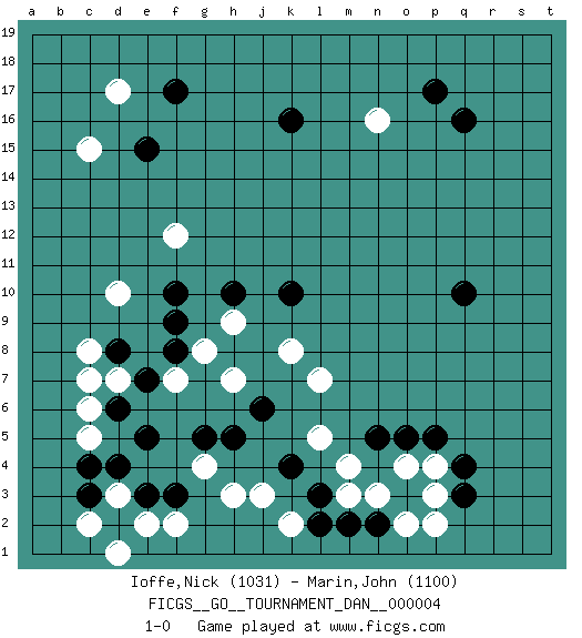 Last move : 1-0 2007 April 26 12:50:40 [Event "FICGS__GO__TOURNAMENT_DAN__000004"] [Site "FICGS"] [Date "2007.02.11"] [Round "1"] [Black "Ioffe,Nick"] [White "Marin,John"] [Result "1-0"] [Rating 1 "1031"] [Rating 2 "1100"] 1.q16 d17 2.q4 d3 3.q10 c15 4.k16 c5 5.k4 d10 6.k10 h9 7.f10 h3 8.f3 g4 9.f17 h7 10.e15 f12 11.h10 k2 12.d2 c2 13.c3 e2 14.d4 d1 15.e3 f2 16.e5 d7 17.e7 c8 18.d6 c6 19.d8 c7 20.c4 f7 21.f8 g8 22.f9 m4 23.o3 l5 24.j6 l7 25.g5 k8 26.l3 m3 27.l2 j3 28.h5 n16 29.p17 o2 30.m2 p3 31.q3 p4 32.n2 n3 33.p5 p2 34.o5 o4 35.n5 1-0 This go game has been lost on time (started : 2007.02.11 17:54:40) Here are the names of the openings (joseki) played in the four corners : Corner q4 : q4 m4 Hoshi (Hwajeom, Seongjeom, Xingwei`) 4-4 Point. The star or hoshi (4-4) point, emphasizing influence at the potential expense of territory. Corner q16 : q16 n16 Hoshi (Hwajeom, Seongjeom, Xingwei`) 4-4 Point. The star or hoshi (4-4) point, emphasizing influence at the potential expense of territory. Nikken Takagakari (Dukan Nop'dakeolch'im, E`r Gaojia, 2-Space High Approach). White 2 is a light approach move. Rarely played in even games, White 2 is typically employed in handicap games. Black continues with 6-4 or 3-10. In Korean Sunjang Baduk Black has a stone on 8-4. Player Black won this Go (weiqi, baduk) game. Follow this game move after move (download)There are players who don't accept exchange: they play many moves that perpetuate a previous state of the game. (Pierre Audouard) A person who never made a mistake never tried anything new. (Albert Einstein)