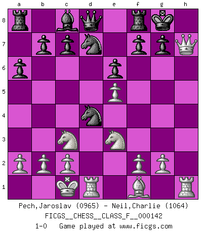 Last move : 1-0 2014 April 30 9:13:9 [Event "FICGS__CHESS__CLASS_F__000142"] [Site "FICGS"] [Date "2014.01.06"] [Round "1"] [White "Pech,Jaroslav"] [Black "Neil,Charlie"] [Result "1-0"] [WhiteElo "0965"] [BlackElo "1064"] 1.e4 e6 2.d4 d5 3.Nc3 Nf6 4.Bg5 Be7 5.e5 Nfd7 6.h4 Bxg5 7.hxg5 Qxg5 8.Nh3 Qe7 9.Nf4 a6 10.Qh5 Nc6 11.Nfxd5 Qd8 12.Ne3 Nxd4 13.O-O-O O-O 14.Qxh7+ 1-0 French : Albin-Alekhine-Chatard attack Queenside Castling by player White (move 13) Kingside Castling by player Black (move 13) Player White won this chess game. Follow this game move after move (download)Chess is the art which expresses the science of logic. (Mikhail Botvinnik) Ich glaube nicht an Psychologie, ich glaube an gute Züge. (Robert James Fischer) Bobby es la celebridad menos entendida y malinterpretada que camina el la faz de esta tierra. (Yasser Seirawan) A chaque perte on perd un peu de soi. (Joël Lautier) Computers make it easier to do a lot of things, but most of the things they make it easier to do don't need to be done. (Andy Rooney)