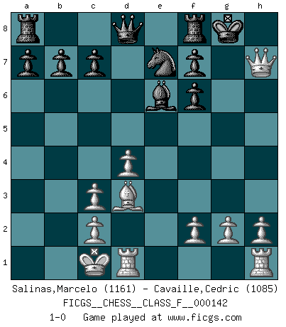 Last move : 1-0 2014 March 4 20:47:11 [Event "FICGS__CHESS__CLASS_F__000142"] [Site "FICGS"] [Date "2014.01.06"] [Round "1"] [White "Salinas,Marcelo"] [Black "Cavaille,Cedric"] [Result "1-0"] [WhiteElo "1161"] [BlackElo "1085"] 1.e4 e5 2.Nf3 Nc6 3.d3 d5 4.Bg5 Be7 5.Bxe7 Ngxe7 6.Ng5 dxe4 7.Nxe4 O-O 8.Qh5 Be6 9.Nbc3 Nd4 10.O-O-O Nd5 11.Qxe5 Nxc3 12.bxc3 Nc6 13.Qh5 Ne7 14.d4 Bxa2 15.Bd3 Be6 16.Nf6+ gxf6 17.Qxh7+ 1-0 King's pawn game Kingside Castling by player Black (move 7) Queenside Castling by player White (move 10) Player White won this chess game. Follow this game move after move (download)Chess is imagination. (David Bronstein) Wenn es im Universum noch irgendwo intelligente Lebewesen gibt, dann kennen sie Go. (Emanuel Lasker) Un entendimiento minucioso de las típicas continuaciones de mate hacen de las mas complicadas combinaciones de sacrificio que conducen hacia ellas no solo no dificiles, sino casi un asunto de rutina. (Siegbert Tarrasch) On est toujours la mazette de quelqu'un d'autre. (Anonyme) Wipe them out. All of them. (Darth Sidious in Star Wars ep.1)