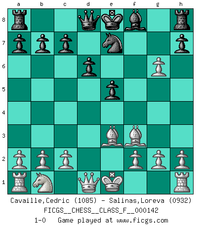 Last move : 1-0 2014 February 18 1:20:37 [Event "FICGS__CHESS__CLASS_F__000142"] [Site "FICGS"] [Date "2014.01.06"] [Round "1"] [White "Cavaille,Cedric"] [Black "Salinas,Loreva"] [Result "1-0"] [WhiteElo "1085"] [BlackElo "0932"] 1.e4 Nc6 2.Nf3 e5 3.d4 Nxd4 4.Nxd4 d6 5.Nf3 Bg4 6.Be2 Bxf3 7.Bxf3 g6 8.Be3 f5 9.exf5 Ne7 10.fxg6 1-0 This chess game has been lost on time (started : 2014.01.06 1:7:26) KP : Nimzovich defense Player White won this chess game. Follow this game move after move (download)Everything is in a state of flux, and this includes the world of Chess. (Mikhail Botvinnik) Die starken Figuren des Gegners muss man abtauschen. (José Raúl Capablanca) El Ajedrez, como la música, como el amor, tiene el poder de hacer feliz a la gente. (Siegbert Tarrasch) Les pièces de l'échiquier étaient impitoyables. Elles le retenaient, elles l'absorbaient. Il y avait de l'horreur en cela, mais aussi une harmonie unique. Car, qu'y a-t-il dans le monde, à part les échecs ? (V. Nabokov) You have to believe in yourself. (Sun Tzu)