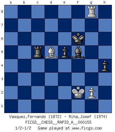 Last move : 1/2-1/2 2014 April 22 23:7:7 [Event "FICGS__CHESS__RAPID_A__000155"] [Site "FICGS"] [Date "2014.01.06"] [Round "1"] [White "Vasquez,Fernando"] [Black "Riha,Josef"] [Result "1/2-1/2"] [WhiteElo "1872"] [BlackElo "1974"] 1.e4 c5 2.c3 Nf6 3.e5 Nd5 4.d4 cxd4 5.cxd4 d6 6.Nf3 Nc6 7.Bc4 e6 8.O-O Be7 9.Qe2 O-O 10.Nc3 dxe5 11.dxe5 Nxc3 12.bxc3 Qc7 13.Bd3 b6 14.Qe4 g6 15.Bh6 Rd8 16.Rad1 Rd5 17.c4 Ra5 18.Qf4 Bd7 19.Rfe1 Rd8 20.Bg5 Be8 21.Bxe7 Qxe7 22.Rd2 Nb4 23.Bb1 Rxd2 24.Nxd2 Bc6 25.Nb3 Ra4 26.Rd1 Kg7 27.Nd4 Be8 28.Rd2 a6 29.h4 b5 30.cxb5 axb5 31.Qg5 Qxg5 32.hxg5 Nd5 33.Ne2 b4 34.f3 Ra5 35.Be4 Nc3 36.Nxc3 bxc3 37.Rc2 Rxe5 38.Rxc3 Rxg5 39.Rc8 Bb5 40.Rc7 h5 41.Kf2 Kf6 42.f4 Rg4 43.Rc5 Be8 44.Ke3 g5 45.fxg5+ Rxg5 46.Rc8 Bd7 47.Rc7 Bb5 48.Bf3 h4 49.Kf2 Rf5 50.Ke3 Ba6 51.a4 Ra5 52.Bd1 Rd5 53.Bf3 Rd3+ 54.Kf2 Ra3 55.Bh5 Bd3 56.Rxf7+ Kg5 57.Bf3 Rxa4 58.Rg7+ Kf6 59.Rd7 Bg6 60.Rd8 e5 61.Bb7 Rf4+ 62.Bf3 Rc4 63.Bb7 Rc7 64.Bd5 Bf5 65.Rg8 Rc2+ 66.Kf3 Rc3+ 67.Kf2 Rc5 1/2-1/2 Sicilian : Alapin's variation (2.c3) Kingside Castling by player White (move 8) Kingside Castling by player Black (move 9) 10 pieces endgame at move 56 : White KRBPP , Black KRBPP WHITE : King + 1 Rook 1 Bishop 2 Pawns BLACK : King + 1 Rook 1 Bishop 2 Pawns 9 pieces endgame at move 57 : White KRBP , Black KRBPP WHITE : King + 1 Rook 1 Bishop 1 Pawn BLACK : King + 1 Rook 1 Bishop 2 Pawns This chess game ended in a draw. Follow this game move after move (download)Tactics flow from a superior position. (Bobby Fischer) Die Arbeit ist etwas Unnatürliches. Die Faulheit allein ist göttlich. (Anatole France) En la vida, como en el Ajedrez, los Peones propios obstruyen nuestro camino. La gran fortuna de un hombre, su comodidad, placer, hijos, libros, que deberían ayudarle a ganar, con mucha frecuencia lo ponen en Jaque Mate. (Charles Buxton) Même si l'adversaire joue le coup analysé précédemment, recommencez l'analyse en voyant la nouvelle position. Première règle de Blumenfeld It's not a bug - it's an undocumented feature. (Anonymous)