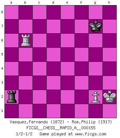 Last move : 1/2-1/2 2014 April 12 22:48:23 [Event "FICGS__CHESS__RAPID_A__000155"] [Site "FICGS"] [Date "2014.01.06"] [Round "1"] [White "Vasquez,Fernando"] [Black "Roe,Philip"] [Result "1/2-1/2"] [WhiteElo "1872"] [BlackElo "1917"] 1.e4 c6 2.d4 d5 3.e5 c5 4.dxc5 Nc6 5.Nf3 e6 6.Be3 Nh6 7.Bxh6 gxh6 8.Bb5 Bxc5 9.O-O Bd7 10.a4 Qc7 11.Qe2 a6 12.Bxc6 bxc6 13.Nbd2 Rg8 14.Rfd1 Be7 15.Qe3 Rg6 16.Ne1 Qa7 17.Qf3 Qd4 18.Nd3 Qg4 19.Qxg4 Rxg4 20.h3 Rd4 21.b3 c5 22.Ne1 Bg5 23.Nef3 Rb4 24.c3 Rb7 25.Nxg5 hxg5 26.c4 h6 27.Rac1 Rc8 28.f4 gxf4 29.Rf1 Ke7 30.Rxf4 Rg8 31.cxd5 exd5 32.Rxc5 Bxh3 33.Rf2 Be6 34.Rc6 Rg5 35.Rxa6 Rxe5 36.Rc6 d4 37.Rc1 Bxb3 38.Nf3 Ra5 39.Nxd4 Rxa4 40.Nxb3 Rxb3 41.Rcf1 f6 42.Rxf6 Rb1 43.Rxh6 Rxf1+ 44.Kxf1 Ra2 45.Kg1 Kf7 46.Kh2 Kg7 47.Rb6 1/2-1/2 Caro-Kann : Advance variation Kingside Castling by player White (move 9) 10 pieces endgame at move 40 : White KRRNP , Black KRRPP WHITE : King + 2 Rooks 1 Knight 1 Pawn BLACK : King + 2 Rooks 2 Pawns 9 pieces endgame at move 40 : White KRRP , Black KRRPP WHITE : King + 2 Rooks 1 Pawn BLACK : King + 2 Rooks 2 Pawns 8 pieces endgame at move 42 : White KRRP , Black KRRP WHITE : King + 2 Rooks 1 Pawn BLACK : King + 2 Rooks 1 Pawn 7 pieces endgame at move 43 : White KRRP , Black KRR WHITE : King + 2 Rooks 1 Pawn BLACK : King + 2 Rooks 6 pieces endgame at move 43 : White KRP , Black KRR WHITE : King + 1 Rook 1 Pawn BLACK : King + 2 Rooks 5 pieces endgame at move 44 : White KRP , Black KR WHITE : King + 1 Rook 1 Pawn BLACK : King + 1 Rook This chess game ended in a draw. Follow this game move after move (download)If your opponent offers you a draw, try to work out why he thinks he's worse off. (Nigel Short) Als er Schachweltmeister wurde ließ er praktisch alle stärksten Sovietspieler für sich arbeiten. Wenn ein auch nur mittelmässiger Meister ein Spezialist für eine bestimmte Eröffnung war, wurde er von Karpov gerufen. Das wurde alles geheim gehalten. (Mikhail Moiseyevich Botvinik) Debes de llevar a tu oponente hacia un profundo y obscuro bosque donde 2+2=5, y el camino que conduce a la salida es suficientemente ancho para solamente uno. (Mikhail Tal) J'ai vu le vaincu d'Echecs jouer des années durant dans l'espoir de la fête de la victoire. Car tu es plus riche de ce qu'elle existe si même elle n'est point pour toi. Ainsi de la perle du fond des mers. (Antoine de Saint-Exupéry) Man is still the most extraordinary computer of all. (John F. Kennedy)