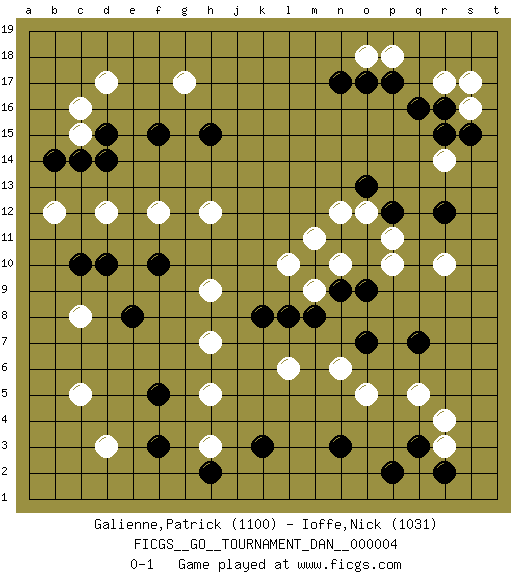Last move : 0-1 2007 March 11 22:18:31 [Event "FICGS__GO__TOURNAMENT_DAN__000004 "] [Site "FICGS"] [Date "2007.02.11"] [Round "1"] [Black "Galienne,Patrick "] [White "Ioffe,Nick "] [Result "0-1"] [Rating 1 "1100"] [Rating 2 "1031"] 1.q16 d17 2.q3 d3 3.d15 d12 4.f15 g17 5.h15 q5 6.d10 c15 7.c14 c16 8.d14 c5 9.k3 r3 10.r2 r4 11.p2 r10 12.q7 o5 13.n3 r14 14.o17 r17 15.r16 s16 16.s15 s17 17.r15 p18 18.p17 o18 19.n17 h3 20.f3 h5 21.f5 h7 22.h2 c8 23.c10 b12 24.b14 f12 25.f10 h12 26.e8 l6 27.o7 n6 28.r12 p10 29.n9 n10 30.p12 o12 31.o13 n12 32.m10 m11 33.m8 l10 34.k8 m9 35.l8 h9 36.o9 p11 0-1 Here are the names of the openings (joseki) played in the four corners : Corner d16 : d17 d15Komoku (Somok, Xiao~mu`) 3-4 Point. The komoku (3-4) point is the traditional corner enclosure move..Ikken Takagakari (Hankan Nop'dakeolch'im, Yi Gaogua`jiao~, 1-Space High Approach). The 5-4 approach move has become more popular in modern times, as modern Go emphasizes speed and influence. Corner q4 : q3 q5Komoku (Somok, Xiao~mu`) 3-4 Point. The komoku (3-4) point is the traditional corner enclosure move..Ikken Takagakari (Hankan Nop'dakeolch'im, Yi Gaogua`jiao~, 1-Space High Approach). The 5-4 approach move has become more popular in modern times, as modern Go emphasizes speed and influence. Corner q16 : q16 r14Hoshi (Hwajeom, Seongjeom, Xingwei`) 4-4 Point. The star or hoshi (4-4) point, emphasizing influence at the potential expense of territory.Ikken Kakari (Hankan Keolch'im, Yi Gua`jiao~, 1-Space Low Approach). White 2 is the standard approach move to the 4-4. Player White won this Go (weiqi, baduk) game.Follow this game move after move (download ) If you don't know ladders, don't play go. (Anonymous) I know the human being and fish can coexist peacefully. (George W. Bush, Saginaw sept. 29, 2000)