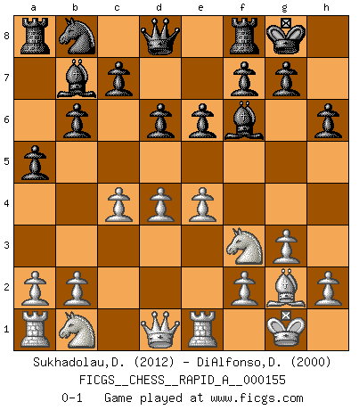 Last move : 0-1 2014 February 18 13:20:12 [Event "FICGS__CHESS__RAPID_A__000155"] [Site "FICGS"] [Date "2014.01.06"] [Round "1"] [White "Sukhadolau,Dzmitry"] [Black "DiAlfonso,Darren"] [Result "0-1"] [WhiteElo "2012"] [BlackElo "2000"] 1.d4 Nf6 2.c4 e6 3.Nf3 b6 4.g3 Bb7 5.Bg2 Be7 6.O-O O-O 7.Re1 a5 8.Bg5 h6 9.Bxf6 Bxf6 10.e4 d6 0-1 This chess game has been lost on time (started : 2014.01.06 2:36:13) Queen's Indian : Old Main line, 6.O-O Kingside Castling by player White (move 6) Kingside Castling by player Black (move 6) Player Black won this chess game. Follow this game move after move (download)Whoever sees no other aim in the game than that of giving checkmate to one's opponent will never become a good Chess player. (Euwe) Ich spiele ehrlich und spiele, um zu gewinnen. Wenn ich verliere nehme ich meine Medizin. (Robert James Fischer) Los asuntos humanos son como una partida de Ajedrez: solo aquellos que no lo toman seriamente, pueden ser llamados buenos jugadores. (Hung Tzu Ch'eng) La solitude du joueur d'Echecs à l'approche du mat est semblable à celle du condamné. (Francis Szpiner) A mistake is only a mistake if you let it happen twice. Otherwise it is a learning experience. (Daniel Parmet)