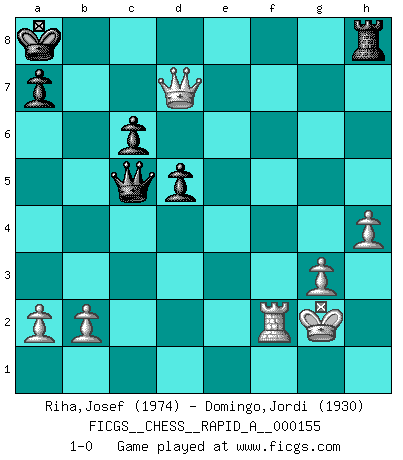 Last move : 1-0 2014 April 4 22:34:25 [Event "FICGS__CHESS__RAPID_A__000155"] [Site "FICGS"] [Date "2014.01.06"] [Round "1"] [White "Riha,Josef"] [Black "Domingo,Jordi"] [Result "1-0"] [WhiteElo "1974"] [BlackElo "1930"] 1.e4 e5 2.Nf3 f5 3.Nxe5 Nf6 4.Bc4 Qe7 5.d4 Nc6 6.O-O fxe4 7.Bf7+ Kd8 8.Nxc6+ bxc6 9.Bb3 d5 10.c4 Qe6 11.cxd5 cxd5 12.Nc3 c6 13.f3 exf3 14.Rxf3 Bd6 15.Qf1 Re8 16.Bg5 Rb8 17.Qf2 Rb7 18.Bxf6+ gxf6 19.Rxf6 Qe7 20.Rf1 Rd7 21.Ba4 Bb7 22.g3 Kc7 23.Kg2 Kb8 24.Qd2 Qg7 25.Bc2 Bc7 26.Rh6 Rh8 27.Na4 Rd6 28.Rh5 Ba6 29.Rf3 Bc8 30.Bf5 Rf6 31.Qb4+ Ka8 32.Nc5 Bb6 33.Bxc8 Rxc8 34.Rxh7 Qxh7 35.Rxf6 Qe7 36.Rf1 Qe2+ 37.Rf2 Bxc5 38.dxc5 Qe3 39.Qg4 Rh8 40.h4 Qxc5 41.Qd7 1-0 Latvian counter-gambit Kingside Castling by player White (move 6) Player White won this chess game. Follow this game move after move (download)I'm not a materialistic person, in that, I don't suffer the lack or loss of money. The absence of worldly goods I don't look back on. For Chess is a way I can be as materialistic as I want without having to sell my soul. (Jamie Walter Adams) Ich würde die 30 stärksten Spieler der USA im Simultanspiel besiegen. (José Raúl Capablanca) Combinaciones deslumbrantes son para la mayoría, mover madera es para los pocos. (Georg Kieninger) Ce qui est bien, c'est d'avoir tout un tas de pièces en prise : l'adversaire ne peut en prendre qu'une à la fois. Cité par Thierry Audin. After growing wildly for years, the field of computing appears to be reaching its infancy. (John Pierce)
