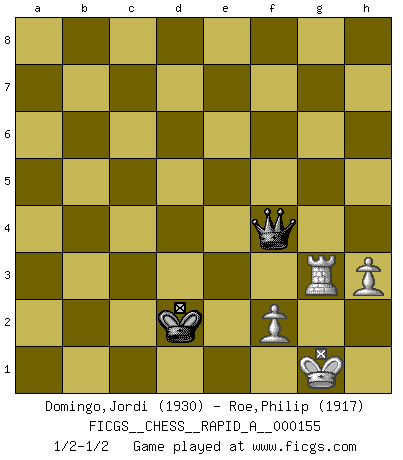 Last move : 1/2-1/2 2014 July 29 17:35:40 [Event "FICGS__CHESS__RAPID_A__000155"] [Site "FICGS"] [Date "2014.01.06"] [Round "1"] [White "Domingo,Jordi"] [Black "Roe,Philip"] [Result "1/2-1/2"] [WhiteElo "1930"] [BlackElo "1917"] 1.g4 d5 2.h3 e5 3.Bg2 c6 4.d4 e4 5.c4 Bd6 6.Nc3 Ne7 7.Bg5 f6 8.Bd2 a5 9.Qb3 a4 10.Nxa4 dxc4 11.Qc2 f5 12.Nc3 Na6 13.gxf5 Nb4 14.Qb1 Nxf5 15.Bxe4 Nxd4 16.Bxh7 Ra5 17.Qe4+ Kf8 18.Qxd4 Rxh7 19.O-O-O Nxa2+ 20.Nxa2 Rxa2 21.Qxc4 Ra1+ 22.Kc2 Rh5 23.Nf3 Rc5 24.Qxc5 Bxc5 25.Rxa1 Bf5+ 26.Kd1 Qd5 27.Ke1 Qb3 28.Bc3 Bb4 29.Kf1 Bxc3 30.bxc3 Qxc3 31.Kg2 Be4 32.Rhd1 Ke7 33.Rac1 Qb4 34.Kg1 c5 35.Ne5 Bf5 36.Nd3 Bxd3 37.exd3 b5 38.Rb1 Qa4 39.Re1+ Kd6 40.Ra1 Qh4 41.Ra6+ Kd5 42.Re3 b4 43.Rg3 Qd8 44.Rxg7 Kd4 45.R7g6 Kc3 46.Rab6 Qd4 47.Rg4 Qe5 48.Rg3 Kc2 49.Rb5 Kd2 50.d4 Qe2 51.Rb8 c4 52.Rxb4 c3 53.Kh2 c2 54.Rb2 Qe4 55.Re3 Qf4+ 56.Kg2 Qxd4 57.Rxc2+ Kxc2 58.Kg1 Qa1+ 59.Kg2 Qa8+ 60.Kg1 Kd2 61.Rg3 Qe4 62.Re3 Qb1+ 63.Kg2 Qf5 64.Rg3 Qe4+ 65.Kg1 Qf4 1/2-1/2 Grob's attack Queenside Castling by player White (move 19) 10 pieces endgame at move 44 : White KRRPPP , Black KQPP WHITE : King + 2 Rooks 3 Pawns BLACK : King + 1 Queen 2 Pawns 9 pieces endgame at move 52 : White KRRPPP , Black KQP WHITE : King + 2 Rooks 3 Pawns BLACK : King + 1 Queen 1 Pawn 8 pieces endgame at move 56 : White KRRPP , Black KQP WHITE : King + 2 Rooks 2 Pawns BLACK : King + 1 Queen 1 Pawn 7 pieces endgame at move 57 : White KRRPP , Black KQ WHITE : King + 2 Rooks 2 Pawns BLACK : King + 1 Queen 6 pieces endgame at move 57 : White KRPP , Black KQ WHITE : King + 1 Rook 2 Pawns BLACK : King + 1 Queen This chess game ended in a draw. Follow this game move after move (download)Chess is a foolish expedient for making idle people believe they are doing something very clever when they are only wasting their time. (George Bernard Shaw) Wer nie einen Fehler gemacht hat, hat nie etwas Neues ausprobiert. (Albert Einstein) El Ajedrez es un juego de pelea el cual es puramente intelectual e incluye la suerte. (Richard Reti) Pour moi, les échecs ne sont pas un jeu mais un art. (Alexandre Alekhine) Wisdom begins at the end. (Daniel Webster)
