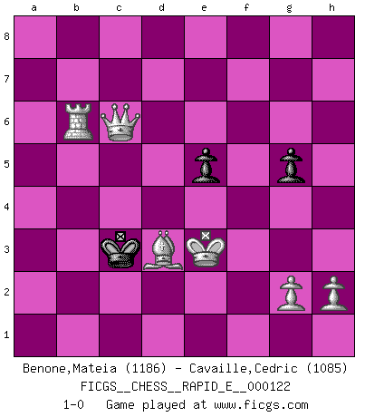 Last move : 1-0 2014 February 18 20:54:58 [Event "FICGS__CHESS__RAPID_E__000122"] [Site "FICGS"] [Date "2014.01.11"] [Round "1"] [White "Benone,Mateia"] [Black "Cavaille,Cedric"] [Result "1-0"] [WhiteElo "1186"] [BlackElo "1085"] 1.Nf3 c5 2.c4 Nf6 3.Nc3 e6 4.d4 cxd4 5.Nxd4 Bb4 6.Ndb5 Bxc3+ 7.bxc3 O-O 8.Ba3 Re8 9.Nd6 Re7 10.Nxc8 Re8 11.Nd6 Qc7 12.Nxe8 Nxe8 13.e4 a6 14.Qb3 Nc6 15.Be2 Ne5 16.f4 Ng6 17.O-O Nxf4 18.Bf3 Qb8 19.Qb4 Nf6 20.Qd6 Qxd6 21.Bxd6 Rc8 22.Bxf4 Rxc4 23.Be5 Nxe4 24.Bd4 Nxc3 25.Bxc3 Rxc3 26.Bxb7 a5 27.Rac1 Rxc1 28.Rxc1 g5 29.a4 d5 30.Rc5 Kg7 31.Rxa5 Kf6 32.Kf2 d4 33.Rc5 e5 34.Be4 h6 35.a5 Ke6 36.Rc6+ Kd7 37.Rxh6 Ke7 38.a6 f6 39.a7 d3 40.Bxd3 Ke6 41.a8Q Kd6 42.Rxf6+ Kc5 43.Ke3 Kb4 44.Rb6+ Kc3 45.Qc6+ 1-0 Reti Opening Kingside Castling by player Black (move 7) Kingside Castling by player White (move 17) 10 pieces endgame at move 40 : White KRBPPP , Black KPPP WHITE : King + 1 Rook 1 Bishop 3 Pawns BLACK : King + 3 Pawns Promotion Queen by player White (move 41) 9 pieces endgame at move 42 : White KQRBPP , Black KPP WHITE : King + 1 Queen 1 Rook 1 Bishop 2 Pawns BLACK : King + 2 Pawns Player White won this chess game. Follow this game move after move (download)Everything is in a state of flux, and this includes the world of Chess. (Mikhail Botvinnik) Es hat in meinem Leben Zeiten gegeben, da ich sehr nahe daran war zu glauben, daß ich auch nicht eine einzige Schachpartie verlieren könnte. (José Raúl Capablanca) Estaba muy claro de que el punto vulnerable del Gran Maestro Americano (Bobby Fischer) radicaba en las posiciones de doble filo, colgantes, irracionales, donde el siempre falló en encontrar un triunfo aún en una posición de clara victoria. (Efim Geller) Le jeu d'échecs est comme rejeté hors du temps. (Antoine de Saint-Exupéry) Programming can only do so much before it becomes too much. (Don Groves)