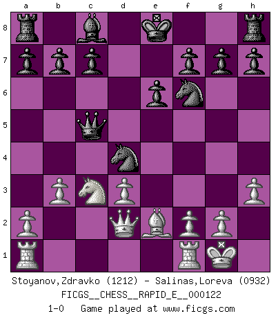 Last move : 1-0 2014 February 26 2:11:56 [Event "FICGS__CHESS__RAPID_E__000122"] [Site "FICGS"] [Date "2014.01.11"] [Round "1"] [White "Stoyanov,Zdravko"] [Black "Salinas,Loreva"] [Result "1-0"] [WhiteElo "1212"] [BlackElo "0932"] 1.e4 d5 2.e5 d4 3.h3 e6 4.Nf3 Bc5 5.Ng5 Qxg5 6.d3 Qxe5+ 7.Be2 Bb4+ 8.Bd2 Bxd2+ 9.Qxd2 Qb5 10.b3 Qc5 11.O-O Nf6 12.c3 Nc6 13.cxd4 Nxd4 14.Nc3 1-0 This chess game has been lost on time (started : 2014.01.11 12:42:49) Scandinavian (centre counter) defense Kingside Castling by player White (move 11) Player White won this chess game. Follow this game move after move (download)It is not enough to be a good player... you must also play well. (Siegbert Tarrasch) Ich kenne keine einzige Person, die behaupten würde, Garri Kasparow sei ein guter Mensch (Nigel Short) Al jugar al Ajedrez entonces, podemos aprender: Primero: Previsión... Segundo: Prudencia... Tercero: Cautela... Y al final, aprendemos del Ajedrez el hábito de no ser desanimados por apariencias malas presentes en el estado de nuestros asuntos, el hábito de la esperanza por una oportunidad favorable y la perseveración de los secretos de los recursos. (Benjamin Franklin) Les échecs c'est le défi de l'alpiniste, toujours plus haut, prêt à tout pour monter à l'assaut du Roi ennemi. Les échecs, c'est de la musique en mouvement, un ballet majestueux pour les yeux. C'est de la poésie composée par les fantômes du passé qui au même titre que Rimbaud ou Verlaine méritent notre admiration. Les échecs, c'est de la peinture ou le moindre mouvement modifie le tableau pour en faire un Picasso ou un Van Gogh. Les échecs, c'est tout et rien, c'est la vie et la mort. Jjulie33 sur le forum de France-Echecs. If only faces could talk... (Pat Summerall, Sportscaster during the Super Bowl)