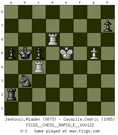 Last move : 0-1 2014 March 21 16:19:23 [Event "FICGS__CHESS__RAPID_E__000122"] [Site "FICGS"] [Date "2014.01.11"] [Round "1"] [White "Jankovic,Mladen"] [Black "Cavaille,Cedric"] [Result "0-1"] [WhiteElo "0873"] [BlackElo "1085"] 1.e4 e5 2.Nf3 Nf6 3.Nxe5 Nxe4 4.Qf3 Nf6 5.Bc4 d5 6.Nxf7 Kxf7 7.Be2 Bd6 8.d4 Bg4 9.Qe3 Bxe2 10.Qxe2 Re8 11.Be3 Bf4 12.O-O Bxe3 13.fxe3 Qe7 14.Nc3 Qxe3+ 15.Qxe3 Rxe3 16.Nxd5 Nc6 17.Nxe3 Nxd4 18.Rad1 Re8 19.Rd3 c5 20.b3 b5 21.c3 Ne2+ 22.Kh1 g5 23.h3 b4 24.Kh2 bxc3 25.Nc2 Nf4 26.Rxc3 Re2 27.Ne3 Ke6 28.Kg3 N6d5 29.Nxd5 Kxd5 30.Kf3 Rxg2 31.h4 Rxa2 32.hxg5 Ne2 33.Rd1+ Kc6 34.Rc4 Nd4+ 35.Ke4 Nxb3 36.Ke5 a5 37.Rd6+ Kb5 0-1 This chess game has been lost on time (started : 2014.01.11 12:42:49) Petrov : Damiano variation Kingside Castling by player White (move 12) 10 pieces endgame at move 35 : White KRRP , Black KRNPPP WHITE : King + 2 Rooks 1 Pawn BLACK : King + 1 Rook 1 Knight 3 Pawns Player Black won this chess game. Follow this game move after move (download)My God, Bobby Fischer plays so simply. (Alexei Suetin) Ich verstehe den Grund nicht, warum die Aufteilung in Frauen und Männer überhaupt im Schach besteht. (Judith Polgar) A través de las casillas del tablero, los Indios explican el movimiento del tiempo y la edad, las influencias mas altas que controlan el mundo y los lazos que vinculan al Ajedrez con el alma humana. (Al-Masudi) Les sacrifices démontrent seulement que quelqu'un a gaffé. (Savielly Tartacover) Fame, I have already. Now I need the money. (an elderly Steinitz)
