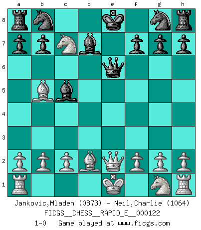 Last move : 1-0 2014 February 9 15:18:42 [Event "FICGS__CHESS__RAPID_E__000122"] [Site "FICGS"] [Date "2014.01.11"] [Round "1"] [White "Jankovic,Mladen"] [Black "Neil,Charlie"] [Result "1-0"] [WhiteElo "0873"] [BlackElo "1064"] 1.e4 e6 2.d4 d5 3.Nc3 Bb4 4.Bd2 c5 5.dxc5 Bxc5 6.Bb5+ Bd7 7.exd5 exd5 8.Qe2+ Qe7 9.Nxd5 Qe6 10.Nc7+ 1-0 French : Winawer, fingerslip variation Player White won this chess game. Follow this game move after move (download)Chess is in its essence a game, in its form an art, and in its execution a science. (Baron Tassilo) Jeder weiß, dass Gasprom Putins persönliches Machtinstrument ist. Die Firma wird vom Kreml aus geleitet und wird schon deshalb nie transparent sein. (Garry Kasparov) Mi estilo es algo parecido entre un poco de Tal y Petrosian. (Reshevsky) On croit qu'il y a plus de mauvais joueurs que de bons joueurs, c'est faux : Il y a autant de joueurs qui gagnent que de joueurs qui perdent. (Philippe Geluck) Faith : not wanting to know what is true. (Friedrich Nietzsche)