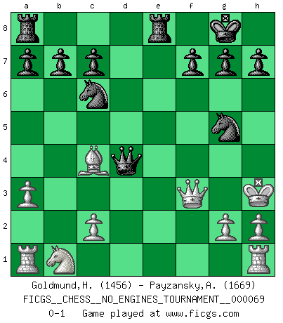 Last move : 0-1 2014 February 28 20:0:6 [Event "FICGS__CHESS__NO_ENGINES_TOURNAMENT__000069"] [Site "FICGS"] [Date "2014.01.12"] [Round "1"] [White "Goldmund,Heike"] [Black "Payzansky,Aleksey"] [Result "0-1"] [WhiteElo "1456"] [BlackElo "1669"] 1.b4 e5 2.Bb2 Bxb4 3.f4 d6 4.fxe5 dxe5 5.Bxe5 Nf6 6.Nf3 Nc6 7.Bb2 O-O 8.a3 Ba5 9.e3 Re8 10.Bc4 Rxe3+ 11.Kf2 Re8 12.d3 Bb6+ 13.d4 Bg4 14.Qd3 Bxf3 15.Qxf3 Bxd4+ 16.Bxd4 Qxd4+ 17.Kg3 Ne4+ 18.Kh3 Ng5+ 0-1 Polish (Sokolsky) opening Kingside Castling by player Black (move 7) Player Black won this chess game. Follow this game move after move (download)The enormous mental resilience, without which no Chess player can exist, was so much taken up by Chess that he could never free his mind of this game. (Albert Einstein) Das Schach ist nichts für kleine Geister, es beansprucht einen vollen Mann, der sich nicht sklavisch an das Überlieferte hält, sondern selbständig die Tiefen des Spiels zu ergründen sucht. (Wilhelm Steinitz) Me gusta decir que Bobby Fischer fue el mejor jugador que jamás haya existido. Pero lo que hizo de Fischer un genio, fue su habilidad de mezclar una frescura y pragmatismo Americano con ideas Rusas acerca de la estrategia. (Bruce Pandolfini) Lorsque vous vous retrouvez devant une position atroce, ne tendez pas un ultime piège dérisoire avec l'intention d'abandonner si l'adversaire le déjoue ! Faites-vous plutôt un devoir de résister comme si votre vie en dépendait. Jouez le coup qui vous déplairait au centuple si vous étiez dans la peau de votre tortionnaire ! There are two kinds of tragedy in this world, one is not getting what you want and the other is getting. (Lord of war)