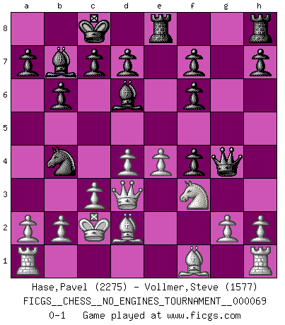 Last move : 0-1 2014 January 19 11:51:24 [Event "FICGS__CHESS__NO_ENGINES_TOURNAMENT__000069"] [Site "FICGS"] [Date "2014.01.12"] [Round "1"] [White "Hase,Pavel"] [Black "Vollmer,Steve"] [Result "0-1"] [WhiteElo "2275"] [BlackElo "1577"] 1.e4 e5 2.f4 exf4 3.Nc3 Qh4+ 4.Ke2 Nc6 5.d4 b6 6.Nf3 Qg4 7.Nd5 Bd6 8.c3 Nf6 9.Nxf6+ gxf6 10.Kd2 Bb7 11.Kc2 O-O-O 12.Qd3 Rde8 13.Bd2 Nb4+ 0-1 KGA : Keres (Mason-Steinitz) gambit Queenside Castling by player Black (move 11) Player Black won this chess game. Follow this game move after move (download)A bad plan is better than none at all. (Frank Marshall) Schach ist wie eine schöne Frau, zu der wir ständig zurückkehren, gleichviel, wie oft sie uns zurückweist. (Anonymous) Aquel que teme a un Peón de Reina aislado, debería de retirarse del Ajedrez. (Siegbert Tarrasch) Vouloir jouer aux échecs contre soi-même est aussi paradoxal que vouloir marcher sur son ombre. (Stefan Zweig) Just because you do not take an interest in politics doesn't mean politics won't take an interest in you. (Pericles 430 B.C.)
