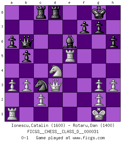 Last move : 0-1 2007 May 29 9:59:23 [Event "FICGS__CHESS__CLASS_D__000031"] [Site "FICGS"] [Date "2007.02.12"] [Round "1"] [White "Ionescu,Catalin"] [Black "Rotaru,Dan"] [Result "0-1"] [WhiteElo "1600"] [BlackElo "1400"] 1.e4 c5 2.Nf3 d6 3.d4 cxd4 4.Nxd4 Nf6 5.Nc3 a6 6.Be3 e5 7.Nb3 Be6 8.Bd3 Nbd7 9.O-O Be7 10.h3 O-O 11.Bg5 h6 12.Bh4 b5 13.a3 Nb6 14.Re1 Qc7 15.Ne2 Na4 16.Qc1 Rac8 17.Nd2 Rfe8 18.Nf3 d5 19.b3 Nc5 20.exd5 Nxd5 21.Bg3 Qb6 22.Qd1 e4 23.Bxe4 Nxe4 24.Ne5 Bd6 25.Nd4 Nxg3 26.fxg3 Nc3 27.Qd3 Bxe5 28.Rxe5 Red8 0-1 Comment by player 2 : Dan Rotaru : Multumesc pentru partida si comentarii. Mi-ar face placere sa jucam din nou. Sicilian : Najdorf, Byrne (English) attack Kingside Castling by player White (move 9) Kingside Castling by player Black (move 10) Player Black won this chess game. Follow this game move after move (download)Later, I began to succeed in decisive games. Perhaps because I realized a very simple truth: not only was I worried, but also my opponent. (Mikhail Tal) Im Spitzenschach von heute geht es nur um Vorbereitung, um tiefgründige, sorgfältige Eröffnungsvorbereitung. (Nigel Short) El Ajedrez es parte de una cultura y si una cultura esta en decadencia, entonces también el Ajedrez declinará. (Mikhail Botvinnik) La victoire dans une partie d'Echecs appartient la plupart du temps à celui qui voit un peu plus loin que l'adversaire. (Lasker) Convictions are more dangerous enemies of truth than lies. (Friedrich Nietzsche)