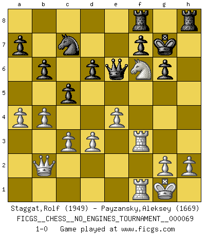 Last move : 1-0 2014 March 4 7:8:40 [Event "FICGS__CHESS__NO_ENGINES_TOURNAMENT__000069"] [Site "FICGS"] [Date "2014.01.12"] [Round "1"] [White "Staggat,Rolf"] [Black "Payzansky,Aleksey"] [Result "1-0"] [WhiteElo "1949"] [BlackElo "1669"] 1.e4 c5 2.Nf3 d6 3.Nc3 Nf6 4.Bb5+ Bd7 5.Bxd7+ Nbxd7 6.O-O g6 7.Re1 Bg7 8.d3 O-O 9.a4 b6 10.Bf4 Nh5 11.Bg5 h6 12.Be3 Ne5 13.Nxe5 Bxe5 14.Bxh6 Bg7 15.Qd2 Bxh6 16.Qxh6 e6 17.Qe3 Ng7 18.Ne2 e5 19.f4 exf4 20.Nxf4 Ne6 21.Nd5 Nc7 22.Nf4 Qf6 23.c3 Ne6 24.Nd5 Qd8 25.Rf1 Nc7 26.Nf6+ Kg7 27.Rf3 Qe7 28.Raf1 Rh8 29.Qf2 Raf8 30.b4 Qe6 31.Qb2 1-0 Sicilian Kingside Castling by player White (move 6) Kingside Castling by player Black (move 8) Player White won this chess game. Follow this game move after move (download)Pawns are born free, yet they are everywhere in chains. (Rick Kennedy) Kasparov ist eine Art Monster mit hundert Augen, denen auch nicht das Geringste entgeht. (Tony Miles) El poder defensivo de una pieza clavada, solamente es imaginario. (Aaron Nimzovich) L'action d'une oeuvre littéraire se déroule sur un champ de bataille. Les masques et les types du drame moderne correspondent aux pièces du jeu d'échecs. L'intrigue correspond aux coups et aux gambits, c'est à dire aux techniques du jeu telles qu'utilisées et interprétées par les joueurs. Les tactiques et les péripéties [mouvements] correspondent aux coups exécutés par l'adversaire. (Viktor Shklovsky) All maxims have their antagonist maxims; proverbs should be sold in pairs, a single one being but a half truth. (William Mathews)