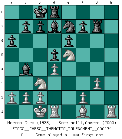 Last move : 0-1 2014 June 8 5:41:3 [Event "FICGS__CHESS__THEMATIC_TOURNAMENT__000174"] [Site "FICGS"] [Date "2014.01.14"] [Round "1"] [White "Moreno,Ciro"] [Black "Sorcinelli,Andrea"] [Result "0-1"] [WhiteElo "1938"] [BlackElo "2000"] 1.e4 e6 2.d4 d5 3.Nc3 Nf6 4.Bg5 Bb4 5.e5 h6 6.exf6 hxg5 7.fxg7 Rg8 8.h4 gxh4 9.Qg4 Qf6 10.Qxh4 Qxg7 11.O-O-O Bd7 12.Nf3 Nc6 13.g3 Ne7 14.Qh6 a6 15.Qxg7 Rxg7 16.Ne5 O-O-O 0-1 French : MacCutcheon, Chigorin variation Queenside Castling by player White (move 11) Queenside Castling by player Black (move 16) Player Black won this chess game. Follow this game move after move (download)For surely of all the drugs in the world, Chess must be the most permanently pleasurable. (Assiac) Die westlichen Werte sind eine Sprache, welche die Putin-Administration nicht versteht. (Garry Kasparov) Tu puedes aprender mucho mas de una partida que pierdas que de una partida ganada. Tendras que perder cientos de partidas antes de llegar a ser un buen jugador. (Jose Raul Capablanca) Les erreurs sont comme les malheurs, elles n'arrivent jamais seules. (Siegbert Tarrasch) If you have any trouble condescending, find a Unix user to show you how it's done. (Scott Adams)