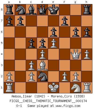 Last move : 0-1 2014 May 4 20:52:37 [Event "FICGS__CHESS__THEMATIC_TOURNAMENT__000174"] [Site "FICGS"] [Date "2014.01.14"] [Round "1"] [White "Ambos,Ilmar"] [Black "Moreno,Ciro"] [Result "0-1"] [WhiteElo "1842"] [BlackElo "1938"] 1.e4 e6 2.d4 d5 3.Nc3 Nf6 4.Bg5 Bb4 5.e5 h6 6.Bd2 Bxc3 7.bxc3 Ne4 8.Qg4 g6 9.h4 c5 10.Bd3 Nxd2 0-1 This chess game has been lost on time (started : 2014.01.14 3:6:29) French : MacCutcheon, Lasker variation Player Black won this chess game. Follow this game move after move (download)You know, comrade Pachman, I don't enjoy being a Minister, I would rather play Chess like you. (Che Guevara) Schach ist ein Teil der Kultur, und wenn es mit der Kultur abwärts geht, geht es auch mit dem Schach abwärts. (Mikhail Moiseyevich Botvinik) El Ajedrez moderno está demasiado preocupado con cosas como la estructura de Peones. Olvidenlo, el Jaque Mate termina la partida. (Nigel Short) Echiquier : carré parfait, comme la Jérusalem nouvelle décrite par l'auteur de l'Apocalypse, huit cases sur huit, exaltation du chiffre 4, symbole du cosmos aux quatre horizons... où le noir et le blanc, l'ombre et la lumière, le mal et le bien s'entremêlent et se conjuguent. (Robert Couffignal, Le Gambit du poète) Statistics can be made to prove anything - even the truth. (Author unknown)
