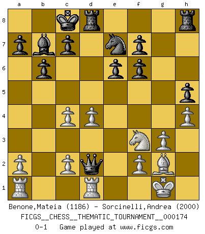 Last move : 0-1 2014 May 12 21:19:16 [Event "FICGS__CHESS__THEMATIC_TOURNAMENT__000174"] [Site "FICGS"] [Date "2014.01.14"] [Round "1"] [White "Benone,Mateia"] [Black "Sorcinelli,Andrea"] [Result "0-1"] [WhiteElo "1186"] [BlackElo "2000"] 1.e4 e6 2.d4 d5 3.Nc3 Nf6 4.Bg5 Bb4 5.exd5 Qxd5 6.Bxf6 Bxc3+ 7.bxc3 gxf6 8.Nf3 b6 9.g3 Qa5 10.Qd2 Bb7 11.Bg2 Nc6 12.O-O O-O-O 13.Rfd1 h5 14.h4 Ne7 15.c4 Qxd2 0-1 This chess game has been lost on time (started : 2014.01.14 3:6:29) French : MacCutcheon variation Kingside Castling by player White (move 12) Queenside Castling by player Black (move 12) Player Black won this chess game. Follow this game move after move (download)Bobby Fischer is the greatest Chess player who has ever lived. (Ken Smith) Unter Putin wird alles Geld aus Russland wie von einem Staubsauger nach Moskau umgeleitet, das ist wie ein schwarzes Loch. (Garry Kasparov) El Peón aislado arroja penumbra sobre todo el tablero. (Aaron Nimzovich) Les Echecs ont trois composantes : le temps, l'espace et le matériel en dernier. (Mikhail Tal) There are two kinds of people in the world, my friend. Those who have a loaded gun and those who dig. You dig ! (Blondie in The Good, The Bad and The Ugly)