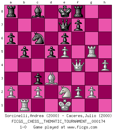 Last move : 1-0 2014 July 15 13:8:12 [Event "FICGS__CHESS__THEMATIC_TOURNAMENT__000174"] [Site "FICGS"] [Date "2014.01.14"] [Round "1"] [White "Sorcinelli,Andrea"] [Black "Caceres,Julio"] [Result "1-0"] [WhiteElo "2000"] [BlackElo "2000"] 1.e4 e6 2.d4 d5 3.Nc3 Nf6 4.Bg5 Bb4 5.e5 h6 6.Bd2 Bxc3 7.bxc3 Ne4 8.Qg4 Kf8 9.Bd3 Nxd2 10.Kxd2 Qe7 11.h4 c5 12.Rh3 Nc6 13.Rg3 g6 14.Qf4 cxd4 15.Rxg6 dxc3+ 16.Ke1 h5 17.Ne2 Ke8 18.Rg5 a6 19.Rb1 Rf8 20.Rxh5 b5 21.Rg5 1-0 This chess game has been lost on time (started : 2014.01.14 3:6:29) French : MacCutcheon, Lasker variation Player White won this chess game. Follow this game move after move (download)If one piece is badly posted, the whole game is bad. (Tarrasch) Vielleicht wirkt die Aura früherer Spieler glanzvoller als die der heutigen Spieler, aber das liegt daran, dass man kein Programm wie Fritz hatte, das einem all die Löcher in ihren Partien zeigt. (Vladimir Kramnik) Debió haber existido una vez en que los hombres eran semidióses, de otra manera no hubiesen podido inventar el Ajedrez. (Gustav Schenk) Je fais ceci parce que dans cinquante coups j'obtiendrai cela; je m'appelle Mikhail Moisevitch Botvinnik. (Botvinnik) Watch your thoughts; they become words. Watch your words; they become actions. Watch your actions; they become habits. Watch your habits; they become character. Watch your character; it becomes your destiny. (Frank Outlaw)
