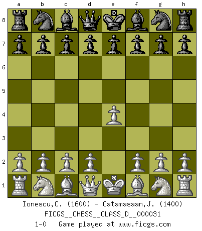 Last move : 1-0 2007 March 24 20:1:5 [Event "FICGS__CHESS__CLASS_D__000031"] [Site "FICGS"] [Date "2007.02.12"] [Round "1"] [White "Ionescu,Catalin"] [Black "Catamasaan,Joseph"] [Result "1-0"] [WhiteElo "1600"] [BlackElo "1400"] 1.e4 1-0 This chess game has been lost on time (started : 2007.02.12 14:22:11) King's pawn Opening Player White won this chess game. Follow this game move after move (download)Chess teaches you to control the initial excitement you feel when you see something that looks good and it trains you to think objectively when you're in trouble. (Stanley Kubrick) Weshalb minderdergeübte Spieler mit g2-g4 beginnen? Die betreffenden sind unschlüssig, ob sie nun rechts (h4) oder links (f4) beginnen sollen, und in ihrer Ratlosigkeit entschliessen sie sich nach guter Bürgerart dazu, den goldenen Mittelweg zu wählen. (Aaron Nimzowitsch) El ganador de una partida es aquel jugador que hace el penúltimo error. (Savielly Tartakover) L'action d'une oeuvre littéraire se déroule sur un champ de bataille. Les masques et les types du drame moderne correspondent aux pièces du jeu d'échecs. L'intrigue correspond aux coups et aux gambits, c'est à dire aux techniques du jeu telles qu'utilisées et interprétées par les joueurs. Les tactiques et les péripéties [mouvements] correspondent aux coups exécutés par l'adversaire. (Viktor Shklovsky) If I had no sense of humor, I would long ago have committed suicide. (Mahatma Gandhi)