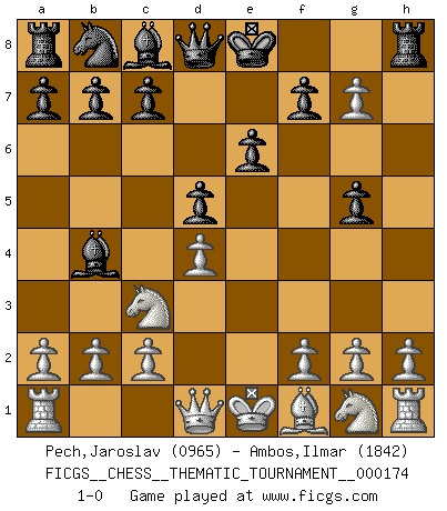 Last move : 1-0 2014 April 28 8:33:34 [Event "FICGS__CHESS__THEMATIC_TOURNAMENT__000174"] [Site "FICGS"] [Date "2014.01.14"] [Round "1"] [White "Pech,Jaroslav"] [Black "Ambos,Ilmar"] [Result "1-0"] [WhiteElo "0965"] [BlackElo "1842"] 1.e4 e6 2.d4 d5 3.Nc3 Nf6 4.Bg5 Bb4 5.e5 h6 6.exf6 hxg5 7.fxg7 1-0 This chess game has been lost on time (started : 2014.01.14 3:6:29) French : MacCutcheon, Chigorin variation Player White won this chess game. Follow this game move after move (download)Live, lose, and learn, by observing your opponent how to win. (Amber Steenbock) Ein guter Spieler hat immer Glück. (José Raúl Capablanca) Con el tiempo, empecé a progresar en partidas decisivas. Tal vez porque me di cuenta de una simple verdad: no solo estaba yo nervioso sino también mi oponente. (Mikhail Tal) En blitz, le Cavalier l'emporte sur le Fou. (Vlastimil Hort) For peace of mind, resign as general manager of the universe. (Douglas Adams)