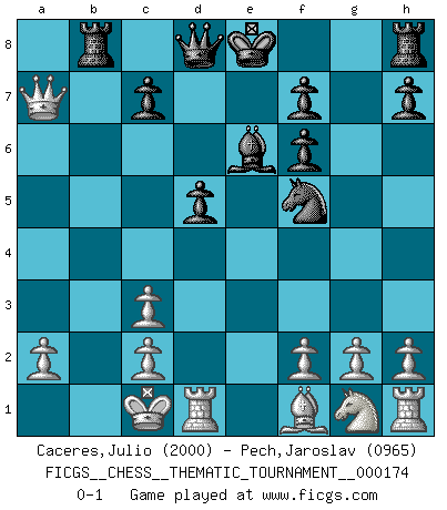 Last move : 0-1 2014 July 8 0:24:46 [Event "FICGS__CHESS__THEMATIC_TOURNAMENT__000174"] [Site "FICGS"] [Date "2014.01.14"] [Round "1"] [White "Caceres,Julio"] [Black "Pech,Jaroslav"] [Result "0-1"] [WhiteElo "2000"] [BlackElo "0965"] 1.e4 e6 2.d4 d5 3.Nc3 Nf6 4.Bg5 Bb4 5.exd5 exd5 6.Qe2+ Be6 7.Qb5+ Nc6 8.Qxb7 Nxd4 9.Bxf6 gxf6 10.O-O-O Bxc3 11.bxc3 Rb8 12.Qxa7 Nf5 0-1 This chess game has been lost on time (started : 2014.01.14 3:6:29) French : MacCutcheon variation Queenside Castling by player White (move 10) Player Black won this chess game. Follow this game move after move (download)Live, lose, and learn, by observing your opponent how to win. (Amber Steenbock) Ich brauche nur einen Blick auf das Schachbrett zu werfen, und weiß schon, was in der Stellung steckt, was geschehen kann und was geschehen wird. Alle übrigen suchen und prüfen, ich aber weiß es! (José Raúl Capablanca) En manos de Fischer's, una diminuta ventaja teórica es tan buena como tener una Reina de ventaja. (Isaac Kashdan) Le jeu d'échecs est comme rejeté hors du temps. (Antoine de Saint-Exupéry) Now the reason the enlightened prince and the wise general conquer the enemy whenever they move and their achievements surpass those of ordinary men is foreknowledge. (Sun Tzu)