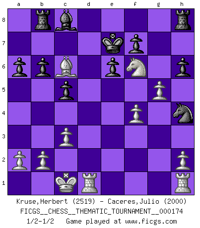 Last move : 1/2-1/2 2014 April 9 1:16:25 [Event "FICGS__CHESS__THEMATIC_TOURNAMENT__000174"] [Site "FICGS"] [Date "2014.01.14"] [Round "1"] [White "Kruse,Herbert"] [Black "Caceres,Julio"] [Result "1/2-1/2"] [WhiteElo "2519"] [BlackElo "2000"] 1.e4 e6 2.d4 d5 3.Nc3 Nf6 4.Bg5 Bb4 5.exd5 Qxd5 6.Bxf6 gxf6 7.Nge2 Nc6 8.Qd2 Bxc3 9.Nxc3 Qxd4 10.Qxd4 Nxd4 11.O-O-O c5 12.Ne4 b6 13.c3 Nf5 14.g4 Nh4 15.Nxf6+ Ke7 16.g5 h6 17.f4 Rb8 18.Bb5 a6 19.Bc6 1/2-1/2 French : MacCutcheon variation Queenside Castling by player White (move 11) This chess game ended in a draw. Follow this game move after move (download)I played Chess with him and would have beaten him sometimes only he always took back his last move, and ran the game out differently. (Mark Twain) Wie bekannt hörte Morphy 1859 auf, Schach zu spielen. Seine Enttäuschung galt nicht so sehr dem Schach, wie den Schachspielern. (Robert James Fischer) La pasion por jugar al Ajedrez es una de las mas inexplicables en el mundo. (H.G. Wells) On peut tirer plus d'utilité d'une partie perdue que de 100 parties gagnées. (Capablanca) Don't anthropomorphize computers - they hate it. (Anonymous)