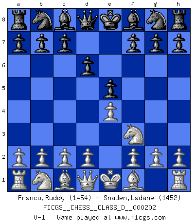 Last move : 0-1 2014 March 20 4:15:2 [Event "FICGS__CHESS__CLASS_D__000202"] [Site "FICGS"] [Date "2014.01.14"] [Round "1"] [White "Franco,Ruddy"] [Black "Snaden,Ladane"] [Result "0-1"] [WhiteElo "1454"] [BlackElo "1452"] 1.e4 e5 2.Nf3 d6 0-1 This chess game has been lost on time (started : 2014.01.14 22:14:40) Philidor's defense Player Black won this chess game. Follow this game move after move (download)My God, Bobby Fischer plays so simply. (Alexei Suetin) Ich habe kein Problem mit Frauen, sondern nur mit dem Niveau ihres Schachspiels (Judith Polgar) El juego de Fischer siempre fue nítido, racional y brillante. Uno de los mejores por siempre. (Dave Regis) Le profane ne songe pas à la somme de jouissance dont il se prive, qui méconnaît ce jeu aux ressources aussi variées que passionnantes. (Jean-Marie Jeanton-Lamarche) A generalist learns less and less about more and more until he knows nothing about everything. (Author unknown)