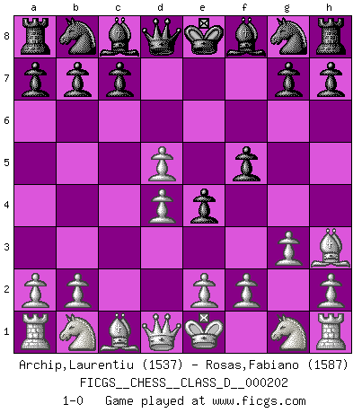Last move : 1-0 2014 February 25 1:53:47 [Event "FICGS__CHESS__CLASS_D__000202"] [Site "FICGS"] [Date "2014.01.14"] [Round "1"] [White "Archip,Laurentiu"] [Black "Rosas,Fabiano"] [Result "1-0"] [WhiteElo "1537"] [BlackElo "1587"] 1.c4 e5 2.d4 e4 3.g3 f5 4.Bh3 d5 5.cxd5 1-0 This chess game has been lost on time (started : 2014.01.14 22:14:40) English Opening Player White won this chess game. Follow this game move after move (download)The tactician knows what to do when there is something to do; whereas the strategian knows what to do when there is nothing to do. (Gerald Abrahams) Es gibt keine einzige Frau, der ich nicht einen Springer vorgeben könnte und trotzdem gewänne. (Robert James Fischer) El Ajedrez es una hermosa aventura. (Bent Larsen) Lorsque vous vous retrouvez devant une position atroce, ne tendez pas un ultime piège dérisoire avec l'intention d'abandonner si l'adversaire le déjoue ! Faites-vous plutôt un devoir de résister comme si votre vie en dépendait. Jouez le coup qui vous déplairait au centuple si vous étiez dans la peau de votre tortionnaire ! Now be brave and don't look back. Don't look back. (Shmi Skywalker in Star Wars ep.1)