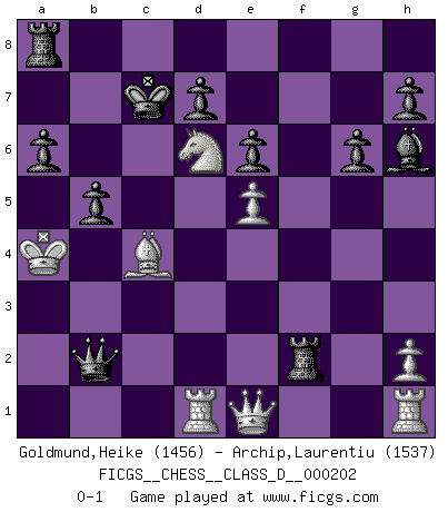 Last move : 0-1 2014 March 16 16:8:20 [Event "FICGS__CHESS__CLASS_D__000202"] [Site "FICGS"] [Date "2014.01.14"] [Round "1"] [White "Goldmund,Heike"] [Black "Archip,Laurentiu"] [Result "0-1"] [WhiteElo "1456"] [BlackElo "1537"] 1.e4 c5 2.b4 cxb4 3.a3 bxa3 4.Nxa3 g6 5.d4 Bg7 6.c3 Nf6 7.e5 Nd5 8.Bd2 Qc7 9.Nb5 Qd8 10.Bc4 e6 11.Nf3 a6 12.Nd6+ Kf8 13.Ng5 Nxc3 14.Bxc3 Qxg5 15.Nxc8 Qxg2 16.Bb4+ Ke8 17.Nd6+ Kd8 18.Nxf7+ Kc8 19.Nd6+ Kc7 20.Ke2 Nc6 21.Bc3 Rhf8 22.Qe1 Qf3+ 23.Kd2 Bh6+ 24.Kc2 Qxf2+ 25.Kb3 Nxd4+ 26.Bxd4 Qxd4 27.Rd1 Rf3+ 28.Ka2 Rf2+ 29.Kb3 Qb2+ 30.Ka4 b5+ 0-1 Sicilian : wing gambit, Carlsbad variation Player Black won this chess game. Follow this game move after move (download)Chess is the gymnasium of the mind. (Blaise Pascal) Obendrein hat der FIDE-Präsident den Revolutionsführer Gaddafi zum »Großmeister« ernannt, am Ende der WM. Das ist lächerlich! (Joel Lautier) Todo se encuentra en un estado de flujo y esto incluye al mundo del Ajedrez. (Mikhail Botvinnik) Psychologiquement, tu dois avoir confiance en toi même, mais cette confiance doit être basée sur des faits. (Robert Fischer) Over-the-board chess is the favorite of mortals, correspondence chess is the favorite of the gods. (Eduard Dyckhoff)