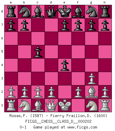 Last move : 0-1 2014 February 25 1:53:47 [Event "FICGS__CHESS__CLASS_D__000202"] [Site "FICGS"] [Date "2014.01.14"] [Round "1"] [White "Rosas,Fabiano"] [Black "Fierry Fraillon,David"] [Result "0-1"] [WhiteElo "1587"] [BlackElo "1600"] 1.e4 c5 2.g3 d5 3.Bg2 dxe4 0-1 This chess game has been lost on time (started : 2014.01.14 22:14:40) Sicilian : Steinitz variation Player Black won this chess game. Follow this game move after move (download)You can only get good at Chess if you love the game. (Bobby Fischer) Man braucht nicht immer den besten Zug zu spielen: Ein Zug muß aktiv, unternehmungslustig, korrekt und schön sein. (David Bronstein) El jugador de combinación piensa hacia adelante; comienza de la posición dada y trabaja las movidas contundentes en su mente. (Emanuel Lasker) Comme les marins qui ont mille raisons différentes d'aller en mer, les joueurs d'échecs en ont tout autant avant de s'installer devant une table et jouer... (Vincent Bertignac, philosophe) The difference between perseverance and obstinacy is that one comes from a strong will, and the other from a strong won't. (Henry Ward Beecher)