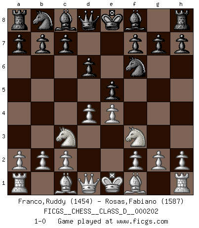 Last move : 1-0 2014 February 24 13:42:6 [Event "FICGS__CHESS__CLASS_D__000202"] [Site "FICGS"] [Date "2014.01.14"] [Round "1"] [White "Franco,Ruddy"] [Black "Rosas,Fabiano"] [Result "1-0"] [WhiteElo "1454"] [BlackElo "1587"] 1.e4 e5 2.Nf3 Nf6 3.d4 d6 4.Nc3 1-0 This chess game has been lost on time (started : 2014.01.14 22:14:40) Petrov : Modern (Steinitz) attack Player White won this chess game. Follow this game move after move (download)Look at Garry Kasparov. After he loses, invariably he wins the next game. He just kills the next guy. That's something that we have to learn to be able to do. (Maurice Ashley) Über Kasparov: Es ist offensichtlich, daß er in einem totalitären Staat aufwuchs und deshalb zu diktatorischen Zügen neigt. (Viktor Kortschnoi) ¿Porque tengo que perder ante este idiota?. (Aron Nimzovich) Des combinaisons [dans le jeu d'échecs] pareilles à des mélodies. Je crois entendre pour ainsi dire la musique des coups... (Vladimir Nabokov) Industry executives and analysts often mistakenly talk about strategy as if it were some kind of chess match. But in chess, you have just two opponents, each with identical resources, and with luck playing a minimal role. The real world is much more like a poker game, with multiple players trying to make the best of whatever hand fortune has dealt them. In our industry, Bill Gates owns the table until someone proves otherwise. (David Moschella, 'Computerworld')