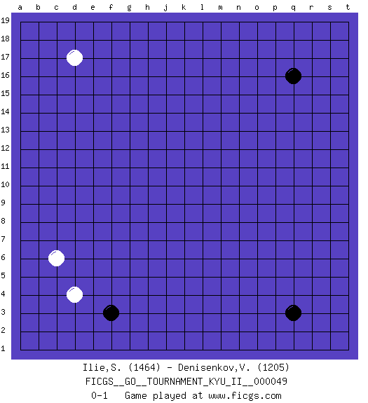 Last move : 0-1 2014 February 17 1:15:6 [Event "FICGS__GO__TOURNAMENT_KYU_II__000049"] [Site "FICGS"] [Date "2014.01.15"] [Round "1"] [Black "Ilie,Sebastian"] [White "Denisenkov,Valentin"] [Result "0-1"] [Rating 1 "1464"] [Rating 2 "1205"] 1.q16 d4 2.q3 d17 3.f3 c6 0-1 This go game has been lost on time (started : 2014.01.15 0:24:58) Here are the names of the openings (joseki) played in the four corners : Corner d4 : d4 f3 Hoshi (Hwajeom, Seongjeom, Xingwei`) 4-4 Point. The star or hoshi (4-4) point, emphasizing influence at the potential expense of territory. Ikken Kakari (Hankan Keolch'im, Yi Gua`jiao~, 1-Space Low Approach). Black 2 is the standard approach move to the 4-4. Player White won this Go (weiqi, baduk) game. Follow this game move after move (download)On the third line, four die, six live. (Anonymous) See no evil, hear no evil, speak no evil. (The 3 monkeys)