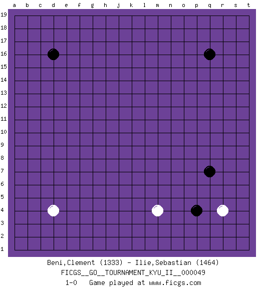 Last move : 1-0 2014 February 18 13:20:12 [Event "FICGS__GO__TOURNAMENT_KYU_II__000049"] [Site "FICGS"] [Date "2014.01.15"] [Round "1"] [Black "Beni,Clement"] [White "Ilie,Sebastian"] [Result "1-0"] [Rating 1 "1333"] [Rating 2 "1464"] 1.q16 r4 2.d16 d4 3.p4 m4 4.q7 1-0 This go game has been lost on time (started : 2014.01.15 0:24:58) Here are the names of the openings (joseki) played in the four corners : Corner q4 : r4 p4 Komoku (Somok, Xiao~mu`) 3-4 Point. The komoku (3-4) point is the traditional corner enclosure move.. Ikken Takagakari (Hankan Nop'dakeolch'im, Yi Gaogua`jiao~, 1-Space High Approach). The 5-4 approach move has become more popular in modern times, as modern Go emphasizes speed and influence. Player Black won this Go (weiqi, baduk) game. Follow this game move after move (download)It is difficult to know exactly what you are doing. (Pierre Audouard) Luck has a peculiar habit of favoring those who don't depend on it. (Author unknown)