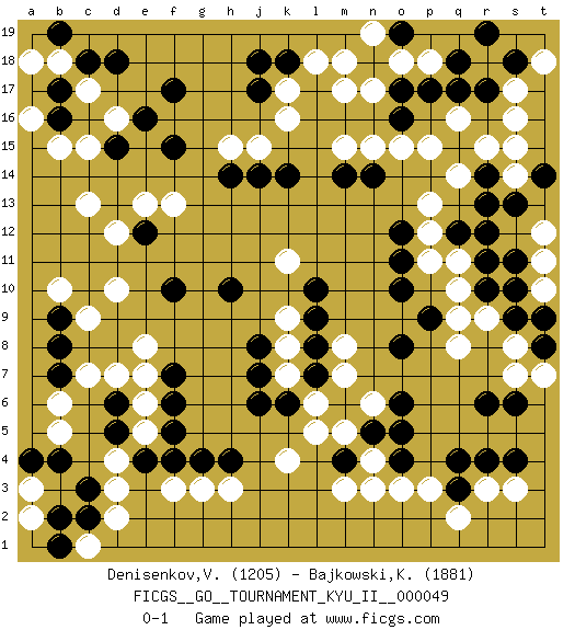 Last move : 0-1 2014 March 23 9:30:9 [Event "FICGS__GO__TOURNAMENT_KYU_II__000049"] [Site "FICGS"] [Date "2014.01.15"] [Round "1"] [Black "Denisenkov,Valentin"] [White "Bajkowski,Karol"] [Result "0-1"] [Rating 1 "1205"] [Rating 2 "1881"] 1.q17 d3 2.q4 d16 3.r11 o3 4.r6 k4 5.f17 k16 6.j17 k17 7.k18 l18 8.j18 m17 9.d18 c17 10.d5 d7 11.f5 f3 12.h4 h3 13.f7 d10 14.f15 c13 15.m4 m3 16.o4 n4 17.n5 n3 18.o5 m5 19.f10 e6 20.f6 e5 21.g4 g3 22.m6 l5 23.j6 k7 24.j7 k8 25.j8 k9 26.h10 p3 27.q15 q8 28.o8 q10 29.r10 r9 30.p9 q9 31.o11 q11 32.r12 p12 33.o12 p13 34.n14 p15 35.o16 q14 36.q12 p11 37.o10 s14 38.r14 r15 39.r13 q16 40.s13 s16 41.s9 s8 42.s11 t10 43.t9 t12 44.t14 s15 45.t8 s7 46.s6 t7 47.s10 t11 48.k6 l6 49.l7 m7 50.l8 k11 51.k14 m15 52.m14 m8 53.l9 n6 54.l10 n15 55.e12 d12 56.e16 j15 57.j14 h15 58.h14 o15 59.o6 r3 60.q3 q2 61.r4 s3 62.s4 e13 63.c3 d2 64.c2 b5 65.b4 b6 66.b2 a3 67.a4 c1 68.r17 s17 69.s18 t18 70.r19 o18 71.o17 p18 72.q18 f13 73.n18 n17 74.o19 m18 75.p17 n19 76.c18 b18 77.d15 c15 78.b16 b15 79.b17 a16 80.b19 a18 81.b1 a2 82.e4 d4 83.f4 e8 84.d6 e7 85.b7 c7 86.b8 c9 87.b9 b10 0-1 Here are the names of the openings (joseki) played in the four corners : Corner q4 : q4 o3 Hoshi (Hwajeom, Seongjeom, Xingwei`) 4-4 Point. The star or hoshi (4-4) point, emphasizing influence at the potential expense of territory. Ikken Kakari (Hankan Keolch'im, Yi Gua`jiao~, 1-Space Low Approach). White 2 is the standard approach move to the 4-4. Corner d16 : d16 f17 Hoshi (Hwajeom, Seongjeom, Xingwei`) 4-4 Point. The star or hoshi (4-4) point, emphasizing influence at the potential expense of territory. Ikken Kakari (Hankan Keolch'im, Yi Gua`jiao~, 1-Space Low Approach). Black 2 is the standard approach move to the 4-4. Corner d4 : d3 d5 Komoku (Somok, Xiao~mu`) 3-4 Point. The komoku (3-4) point is the traditional corner enclosure move.. Ikken Takagakari (Hankan Nop'dakeolch'im, Yi Gaogua`jiao~, 1-Space High Approach). The 5-4 approach move has become more popular in modern times, as modern Go emphasizes speed and influence. Player White won this Go (weiqi, baduk) game. Follow this game move after move (download)Keep inessential ataris till the end. (Anonymous) Wawaweewa ! (Borat: Cultural learnings of America for make benefit glorious nation of Kazakhstan)