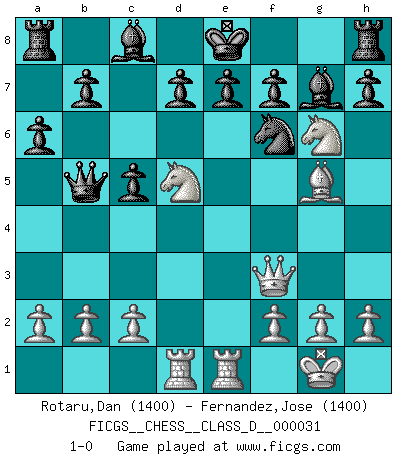 Last move : 1-0 2007 February 21 19:34:32 [Event "FICGS__CHESS__CLASS_D__000031"] [Site "FICGS"] [Date "2007.02.12"] [Round "1"] [White "Rotaru,Dan"] [Black "Fernandez,Jose"] [Result "1-0"] [WhiteElo "1400"] [BlackElo "1400"] 1.e4 c5 2.Nf3 Nc6 3.Bb5 Qc7 4.O-O a6 5.Bxc6 Qxc6 6.d4 Qxe4 7.Nc3 Qc6 8.Ne5 Qd6 9.Re1 Qxd4 10.Qh5 g6 11.Qf3 Nf6 12.Bg5 Bg7 13.Rad1 Qb4 14.Nd5 Qb5 15.Nxg6 1-0 Sicilian : Nimzovich-Rossolimo attack (without ...d6) Kingside Castling by player White (move 4) Player White won this chess game. Follow this game move after move (download)Avoid the crowd. Do your own thinking independently. Be the Chess player, not the Chess piece. (Ralph Charell) Kein Großmeister ist normal. Sie unterscheiden sich nur im Ausmaß Ihrer Verrücktheit. (Viktor Kortschnoi) En el Ajedrez, tal como es jugado por los Maestros, practicamente la suerte es eliminada. (Emanuel Lasker) Le plus grand jeu de l'esprit jamais inventé, plus vous l'apprenez, plus vous y prenez du plaisir. (Garry Kasparov) Shallow men believe in luck. Strong men belive in cause and effect. (Ralph Waldo Emerson)