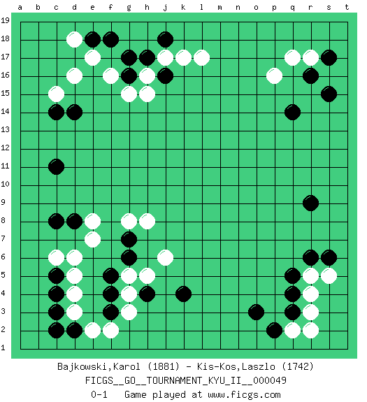 Last move : 0-1 2014 February 18 19:24:41 [Event "FICGS__GO__TOURNAMENT_KYU_II__000049"] [Site "FICGS"] [Date "2014.01.15"] [Round "1"] [Black "Bajkowski,Karol"] [White "Kis-Kos,Laszlo"] [Result "0-1"] [Rating 1 "1881"] [Rating 2 "1742"] 1.r16 d4 2.q4 d16 3.f3 d6 4.k4 p16 5.q14 r17 6.s17 q17 7.s15 l17 8.r9 r3 9.q3 r4 10.q5 r5 11.r6 q2 12.p2 r2 13.o3 g5 14.h4 j6 15.s6 s5 16.g7 h8 17.f5 g4 18.f4 g3 19.g6 h5 20.c3 d3 21.c5 d5 22.c4 c6 23.d2 e2 24.c2 f2 25.c11 g8 26.c8 e8 27.d8 e7 28.c14 c15 29.d14 f16 30.j16 j17 31.h17 h16 32.g16 h15 33.g17 g15 34.e18 e17 35.j18 k17 36.f18 d18 0-1 Here are the names of the openings (joseki) played in the four corners : Corner d4 : d4 f3 Hoshi (Hwajeom, Seongjeom, Xingwei`) 4-4 Point. The star or hoshi (4-4) point, emphasizing influence at the potential expense of territory. Ikken Kakari (Hankan Keolch'im, Yi Gua`jiao~, 1-Space Low Approach). Black 2 is the standard approach move to the 4-4. Corner q16 : r16 p16 Komoku (Somok, Xiao~mu`) 3-4 Point. The komoku (3-4) point is the traditional corner enclosure move.. Ikken Takagakari (Hankan Nop'dakeolch'im, Yi Gaogua`jiao~, 1-Space High Approach). The 5-4 approach move has become more popular in modern times, as modern Go emphasizes speed and influence. Corner d16 : d16 c11 Hoshi (Hwajeom, Seongjeom, Xingwei`) 4-4 Point. The star or hoshi (4-4) point, emphasizing influence at the potential expense of territory. Player White won this Go (weiqi, baduk) game. Follow this game move after move (download)If White takes all four corners, Black should resign; if Black takes all four corners, Black should also resign. (David Kent) Wisdom doesn't necessarily come with age. Sometimes age just shows up all by itself. (Tom Wilson)