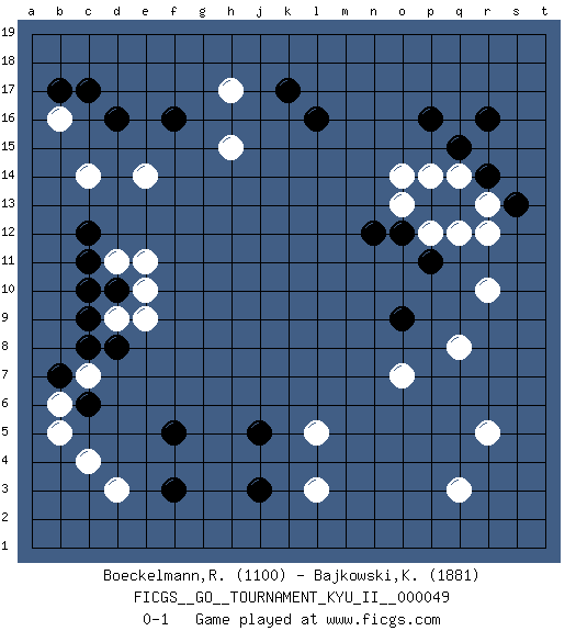 Last move : 0-1 2014 April 5 7:22:25 [Event "FICGS__GO__TOURNAMENT_KYU_II__000049"] [Site "FICGS"] [Date "2014.01.15"] [Round "1"] [Black "Boeckelmann,Raik"] [White "Bajkowski,Karol"] [Result "0-1"] [Rating 1 "1100"] [Rating 2 "1881"] 1.d16 q3 2.r16 c4 3.l16 c14 4.c12 e14 5.f16 b16 6.c9 c7 7.c17 d11 8.c11 d9 9.d10 e10 10.c10 e11 11.d8 e9 12.c8 r10 13.j3 l3 14.f3 r5 15.p16 h17 16.b17 h15 17.k17 d3 18.f5 r13 19.p13 l5 20.j5 p12 21.o12 o13 22.q13 q12 23.r14 o14 24.n12 q14 25.s13 r12 26.q15 p14 27.o9 o7 28.p11 q8 29.b7 b6 30.c6 b5 0-1 This go game has been lost on time (started : 2014.01.15 0:24:58) Here are the names of the openings (joseki) played in the four corners : Corner d16 : d16 c14 Hoshi (Hwajeom, Seongjeom, Xingwei`) 4-4 Point. The star or hoshi (4-4) point, emphasizing influence at the potential expense of territory. Ikken Kakari (Hankan Keolch'im, Yi Gua`jiao~, 1-Space Low Approach). White 2 is the standard approach move to the 4-4. Corner d4 : c4 c9 Komoku (Somok, Xiao~mu`) 3-4 Point. The komoku (3-4) point is the traditional corner enclosure move.. Player White won this Go (weiqi, baduk) game. Follow this game move after move (download)Avoid the plate connection. (Anonymous) Before all elsed, be armed. (Niccolo Machiavelli)