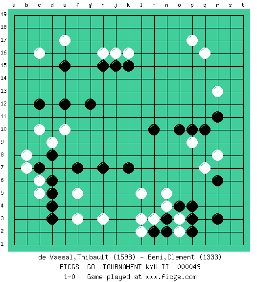 Last move : 1-0 2014 April 23 20:18:35 [Event "FICGS__GO__TOURNAMENT_KYU_II__000049"] [Site "FICGS"] [Date "2014.01.15"] [Round "1"] [Black "de Vassal,Thibault"] [White "Beni,Clement"] [Result "1-0"] [Rating 1 "1598"] [Rating 2 "1333"] 1.d4 q16 2.r3 c16 3.q10 l3 4.n3 f3 5.d3 f5 6.c7 n5 7.p4 r8 8.r6 r13 9.r11 q7 10.o10 e17 11.c12 p17 12.m10 p9 13.p10 c10 14.e12 e10 15.g12 c5 16.d5 c6 17.d6 b7 18.d8 b8 19.f7 h3 20.h7 o3 21.o4 n4 22.p3 o2 23.n2 m3 24.m2 l2 25.p2 k16 26.e15 d9 27.k7 l5 28.h15 h16 29.j15 j16 30.k15 1-0 This go game has been lost on time (started : 2014.01.15 0:24:58) Here are the names of the openings (joseki) played in the four corners : Corner q4 : r3 l3 San-San (Sam-Sam, San-San) 3-3 Point. The San-San (3-3) point, emphasizing territory at the expense of influence. Corner d4 : d4 f3 Hoshi (Hwajeom, Seongjeom, Xingwei`) 4-4 Point. The star or hoshi (4-4) point, emphasizing influence at the potential expense of territory. Ikken Kakari (Hankan Keolch'im, Yi Gua`jiao~, 1-Space Low Approach). White 2 is the standard approach move to the 4-4. Player Black won this Go (weiqi, baduk) game. Follow this game move after move (download)Territory really exists only in the end. (Pierre Audouard) Vladimir Ras-Putin is still alive... He is also a good actor, I saw him in the Lord of the Rings. (Rodolfo d'Ettorre)