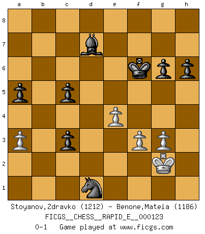 Last move : 0-1 2014 February 11 16:46:24 [Event "FICGS__CHESS__RAPID_E__000123"] [Site "FICGS"] [Date "2014.01.19"] [Round "1"] [White "Stoyanov,Zdravko"] [Black "Benone,Mateia"] [Result "0-1"] [WhiteElo "1212"] [BlackElo "1186"] 1.e4 c5 2.Nf3 Nc6 3.Bb5 g6 4.Bxc6 dxc6 5.h3 Bg7 6.O-O Nf6 7.d3 O-O 8.Re1 Qc7 9.Nbd2 Rd8 10.Nc4 b5 11.Ncd2 a5 12.Nb3 Nd7 13.c3 c4 14.dxc4 Ne5 15.Qe2 Nd3 16.Rd1 bxc4 17.Nbd4 Rb8 18.Ng5 c5 19.Ndf3 h6 20.Nxf7 Kxf7 21.g3 Bxh3 22.Bf4 e5 23.Bxe5 Bxe5 24.Nxe5+ Qxe5 25.Qf3+ Qf6 26.Qxf6+ Kxf6 27.Rd2 Rxb2 28.Rxb2 Nxb2 29.Re1 Rd1 30.Rxd1 Nxd1 31.f3 Nxc3 32.a3 Nd1 33.Kh2 Bd7 34.Kg2 c3 0-1 Sicilian : Nimzovich-Rossolimo attack (with ...g6, without ...d6) Kingside Castling by player White (move 6) Kingside Castling by player Black (move 7) Player Black won this chess game. Follow this game move after move (download)Even the laziest King flees wildly in the face of a double check ! (Aaron Nimzowitsch) Man gibt nur Pakete auf. (Paul Keres) El Ajedrez era la lengua materna de Capablanca. (Reti) Ce qui caractérise les parties de combat, c'est que si le défenseur a constamment de difficiles problèmes à résoudre, l'attaquant doit chercher sans relâche de nouvelles possibilités d'attaque. (Koblentz) History is a gallery of pictures in which there are few originals and many copies. (Alexis de Tocqueville)