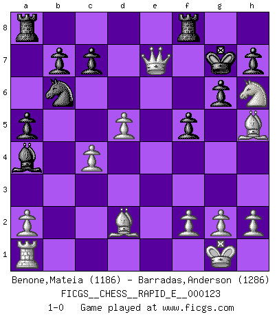 Last move : 1-0 2014 March 7 1:43:46 [Event "FICGS__CHESS__RAPID_E__000123"] [Site "FICGS"] [Date "2014.01.19"] [Round "1"] [White "Benone,Mateia"] [Black "Barradas,Anderson"] [Result "1-0"] [WhiteElo "1186"] [BlackElo "1286"] 1.Nf3 Nf6 2.c4 e6 3.d4 d5 4.Nc3 Bb4 5.cxd5 Nxd5 6.Bd2 Bxc3 7.bxc3 O-O 8.e4 Nb6 9.Be2 a6 10.O-O Bd7 11.c4 Ba4 12.Qc1 Nc6 13.d5 exd5 14.exd5 Ne7 15.Qa3 Qd7 16.Ne5 Qe8 17.Bb4 Nbc8 18.Rfe1 a5 19.Bd2 Nb6 20.Bh5 g6 21.Ng4 f5 22.Nh6+ Kg7 23.Rxe7+ Qxe7 24.Qxe7+ 1-0 Reti Opening Kingside Castling by player Black (move 7) Kingside Castling by player White (move 10) Player White won this chess game. Follow this game move after move (download)Up to this point White has been following well-known analysis. But now he makes a fatal error: he begins to use his own head. (Siegbert Tarrasch) Ihnen, Herr Lasker, habe ich nur drei Worte zu sagen: Schach und matt. (Siegbert Tarrasch) El sobresalir en el Ajedrez es un signo de una mente intrigante. (Sir Arthur Conan Doyle) Même un GMI sait rarement calculer sur plus de cinq coups une attaque à sacrifices. (Rudolf Spielmann) The worth of a book is to be measured by what you can carry away from it. (James Bryce)