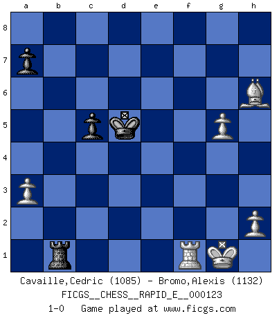 Last move : 1-0 2014 January 29 21:29:26 [Event "FICGS__CHESS__RAPID_E__000123"] [Site "FICGS"] [Date "2014.01.19"] [Round "1"] [White "Cavaille,Cedric"] [Black "Bromo,Alexis"] [Result "1-0"] [WhiteElo "1085"] [BlackElo "1132"] 1.e4 e5 2.Nf3 Nc6 3.Bb5 d6 4.Bxc6+ bxc6 5.d4 Nf6 6.d5 c5 7.c4 Ba6 8.Nbd2 h6 9.a3 Nxe4 10.Nxe4 Bxc4 11.b3 Ba6 12.Nfd2 f5 13.Qh5+ Kd7 14.Qxf5+ Ke8 15.Qe6+ Qe7 16.Qxe7+ Bxe7 17.Nc4 Rf8 18.O-O Rb8 19.Ned2 Bg5 20.Rb1 Bxd2 21.Bxd2 Kd7 22.f4 Rbe8 23.g4 e4 24.f5 Bxc4 25.bxc4 Re5 26.Rbe1 Rb8 27.f6 gxf6 28.Rxf6 e3 29.Rxe3 Rxe3 30.Bxe3 Rb3 31.Bc1 Rb1 32.Rf1 c6 33.dxc6+ Kxc6 34.Bxh6 d5 35.cxd5+ Kxd5 36.g5 1-0 Ruy Lopez : Old Steinitz defense Kingside Castling by player White (move 18) 10 pieces endgame at move 35 : White KRBPPP , Black KRPP WHITE : King + 1 Rook 1 Bishop 3 Pawns BLACK : King + 1 Rook 2 Pawns Player White won this chess game. Follow this game move after move (download)In complicated positions, Bobby Fischer hardly had to be afraid of anybody. (Paul Keres) Im Blitz ist es einfacher mit einer Figur weniger anzugreifen, als sich mit einer Mehrfigur zu verteidigen. (Mikhail Nekhemyevich Tal) Un jugador que trata de regresar una movida en el Ajedrez es un futuro carterista. (Richard Fenton) C'est une question de caractère, Beaucoup de gens perdent leur motivation très vite. D'autres, ils sont rares, peuvent la conserver très longtemps. J'aime les échecs, encore aujourd'hui je suis heureux d'analyser des parties. J'aime toujours gagner, je déteste encore perdre. Bien jouer est important pour mon intégrité intellectuelle et morale. Et puis les échecs vivent en ce moment une période historique grâce à Internet. Ils se développent dans les systèmes éducatifs à travers le monde. Ils sortent de leur ghetto, et c'est mon rôle de mener à bien cette révolution. (Gary Kasparov) The real voyage of discovery consists not in seeking new lands but in seeing with new eyes. (Marcel Proust)
