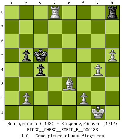 Last move : 1-0 2014 January 30 21:37:0 [Event "FICGS__CHESS__RAPID_E__000123"] [Site "FICGS"] [Date "2014.01.19"] [Round "1"] [White "Bromo,Alexis"] [Black "Stoyanov,Zdravko"] [Result "1-0"] [WhiteElo "1132"] [BlackElo "1212"] 1.d4 d5 2.c4 dxc4 3.Nc3 Bd7 4.e4 e6 5.a3 h6 6.Bxc4 Be7 7.h3 a6 8.Nf3 Nf6 9.e5 Nh7 10.O-O Bc6 11.d5 exd5 12.Nxd5 Bxd5 13.Bxd5 c6 14.Bxf7+ Kxf7 15.Qb3+ Ke8 16.Re1 b5 17.Bf4 Nf8 18.Rad1 Qb6 19.Nd4 c5 20.Nf5 c4 21.Be3 Qg6 22.Qc2 Nc6 23.Qe4 Rc8 24.Nd6+ Bxd6 25.Qxg6+ Nxg6 26.exd6 Nge5 27.Bf4 Kd7 28.Bxe5 Rce8 29.Bxg7 Rxe1+ 30.Rxe1 Rg8 31.Bxh6 Kxd6 32.Rd1+ Kc5 33.Be3+ Nd4 34.Rxd4 Kc6 35.a4 Rb8 36.axb5+ axb5 37.h4 Ra8 38.h5 Rh8 39.g4 Kc5 40.Rd8 1-0 Queen's gambit accepted Kingside Castling by player White (move 10) Player White won this chess game. Follow this game move after move (download)The older I grow, the more I value Pawns. (Keres) Bobby Fischer ist kein Vorbild für die heutige Jugend. (Viktor Kortschnoi) Robert Fischer es la ley hacia si mismo. (Larry Evans) Tout change constamment, y compris dans le monde des Echecs. (Botvinnik) Perhaps chess is the wrong game for the times (The Chess Master and the Computer, by Garry Kasparov - 2010)