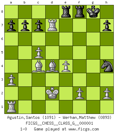 Last move : 1-0 2006 August 13 19:15:22 [Event "FICGS__CHESS__CLASS_G__000001"] [Site "FICGS"] [Date "2006.05.25"] [Round "1"] [White "Agustin,Santos"] [Black "Werhan,Matthew"] [Result "1-0"] [WhiteElo "1091"] [BlackElo "0893"] 1.d4 Nf6 2.c4 d5 3.cxd5 Qxd5 4.Nc3 Qa5 5.Bd2 e6 6.Qa4+ Qxa4 7.Nxa4 Bd7 8.Nc5 Bxc5 9.dxc5 Ne4 10.Be3 Na6 11.Nf3 Nb4 12.Nd4 Nxc5 13.a3 Nd5 14.b4 e5 15.bxc5 exd4 16.Bxd4 O-O 17.e4 Rae8 18.Bd3 Nf4 19.Kd2 Nxg2 20.Rhg1 Nh4 21.Rxg7+ Kh8 22.Rxf7 Kg8 23.Rg7+ Kh8 24.Rxd7 Kg8 25.Bc4+ 1-0 Queen's pawn game Kingside Castling by player Black (move 16) Player White won this chess game. Follow this game move after move (download)Do you realize Fischer almost never has any bad pieces? He exchanges them, and the bad pieces remain with his opponents. (Yuri Balashov) Die Elozahlen sind sehr schlecht für das Schach. Jetzt ist Schach eine Sportindustrie, die darauf zielt Elopunkte zu machen. (Miguel Najdorf) En la perfecta combinación de Ajedrez como en una historia corta de primera clase, toda la trama y contra trama deberá conducir hacia un final sorprendente, el interes no es mitigado hasta el último momento. (Yates and Winter) On n'a jamais que l'âge auquel on a commence à jouer aux échecs car après on cesse de vieillir. (Capablanca) In my experience, there's no such thing as luck. (Obi-Wan Kenobi in Star Wars ep.4)