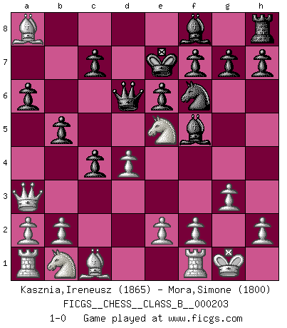 Last move : 1-0 2014 February 4 15:5:38 [Event "FICGS__CHESS__CLASS_B__000203"] [Site "FICGS"] [Date "2014.01.19"] [Round "1"] [White "Kasznia,Ireneusz"] [Black "Mora,Simone"] [Result "1-0"] [WhiteElo "1865"] [BlackElo "1800"] 1.Nf3 d5 2.g3 Nf6 3.Bg2 Nc6 4.d4 Bf5 5.O-O e6 6.c4 dxc4 7.Qa4 a6 8.Ne5 b5 9.Bxc6+ Ke7 10.Qa3+ Qd6 11.Bxa8 1-0 Reti : King's Indian attack (Barcza system) Kingside Castling by player White (move 5) Player White won this chess game. Follow this game move after move (download)Winning isn't everything... but losing is nothing. (Mednis) Obendrein hat der FIDE-Präsident den Revolutionsführer Gaddafi zum »Großmeister« ernannt, am Ende der WM. Das ist lächerlich! (Joel Lautier) La belleza de un movimiento no se refleja solo en su apariencia, sino en el pensamiento detrás de él. (Siegbert Tarrasch) Il (Jacob Murray) ne joue pas pour le bon coup, mais pour le meilleur. (Eloi Relange) He who is a good ruler must first have been ruled. (Aristotle)